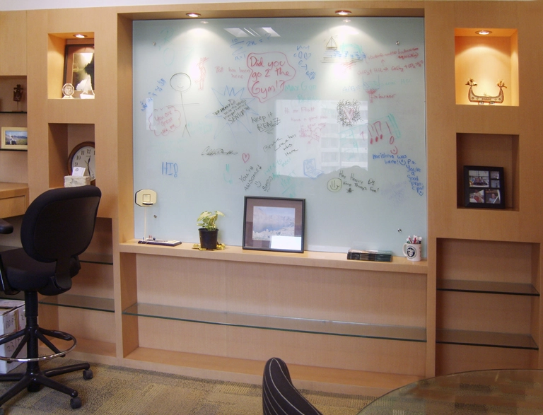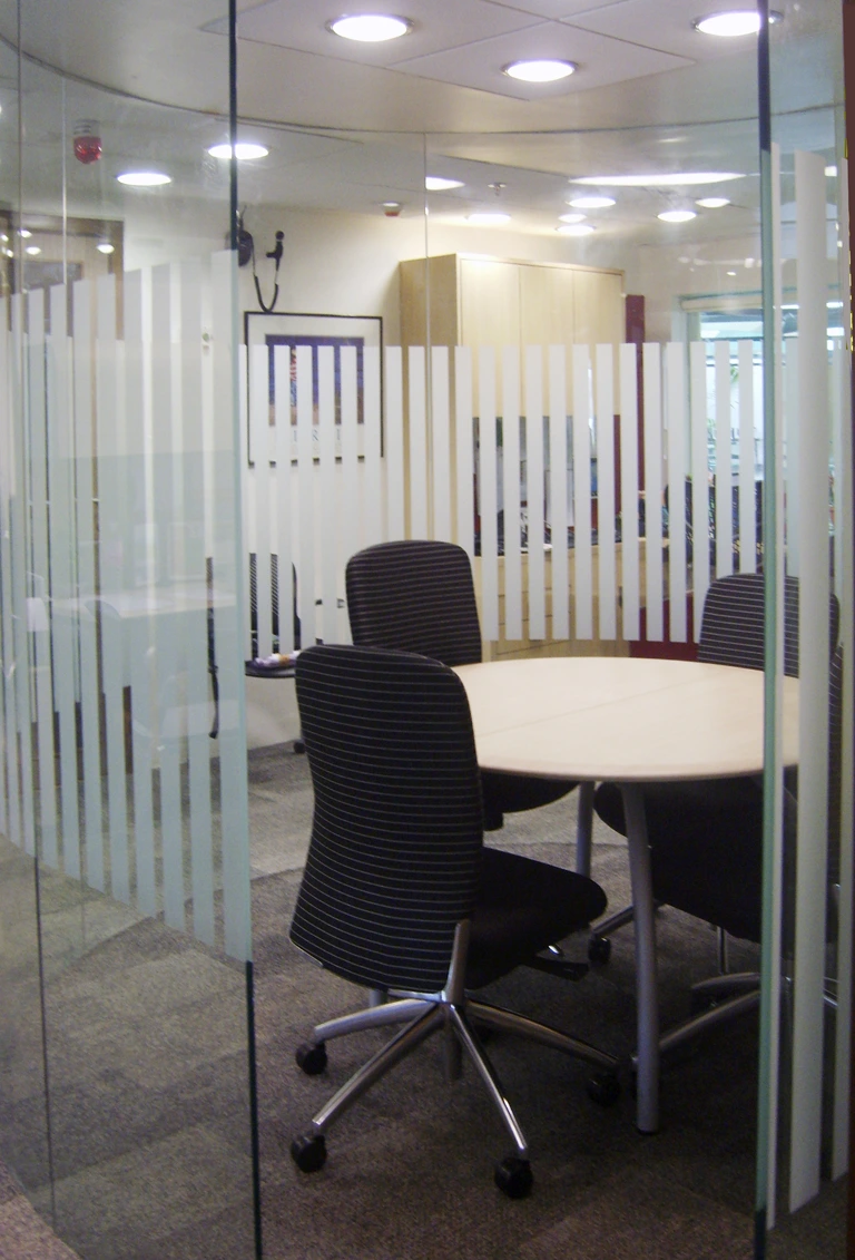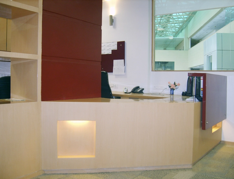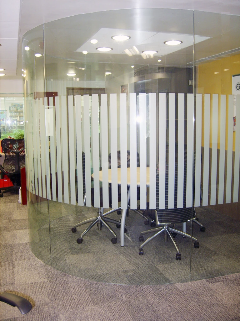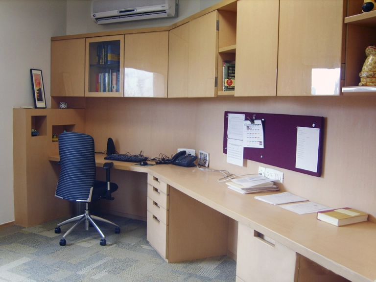 Modular furniture was combined with on-site carpentry work to suit the requirements of over 17 staff members in a 1200 sq. ft area and it also included an all-glass cylindrical meeting room in the centre of the office area.