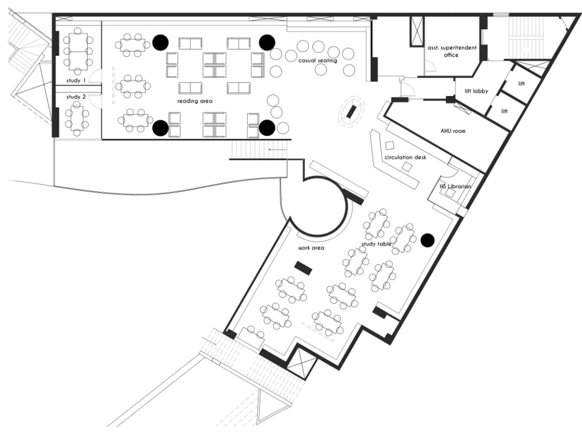 The spaces were reorganized to accommodate a new circulation desk area, librarian office, magazine display. By planning more study tables, group and individual reading areas and glass cabins for meetings or group work, the library became a central space for the different groups of the school.