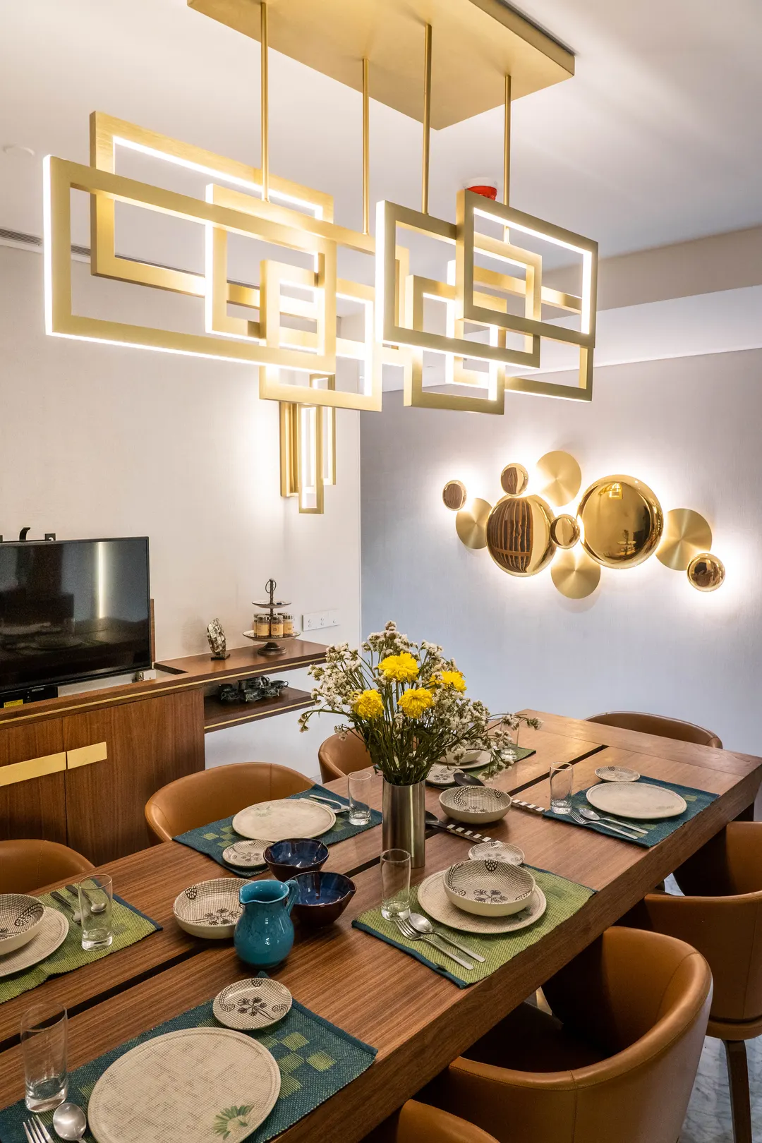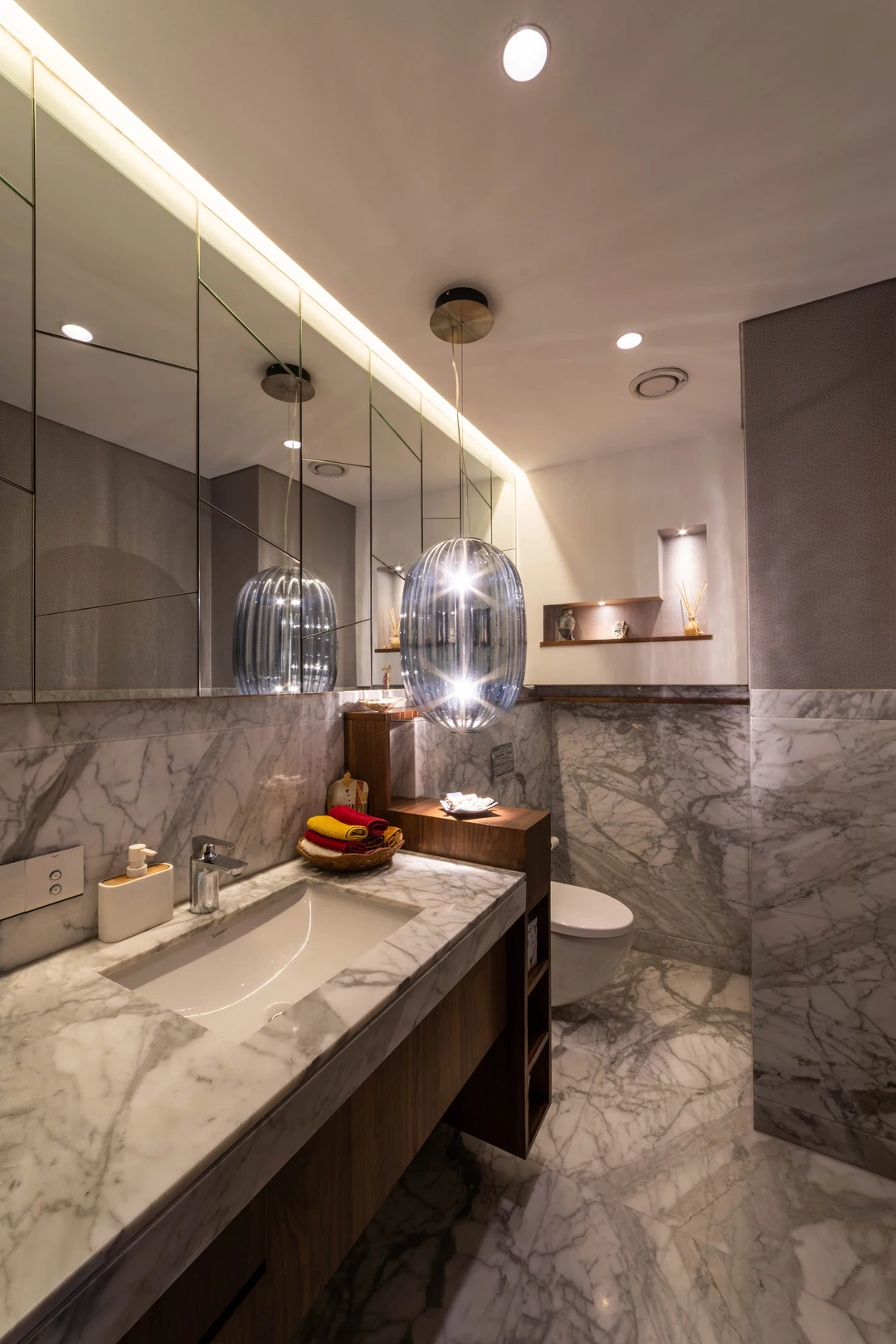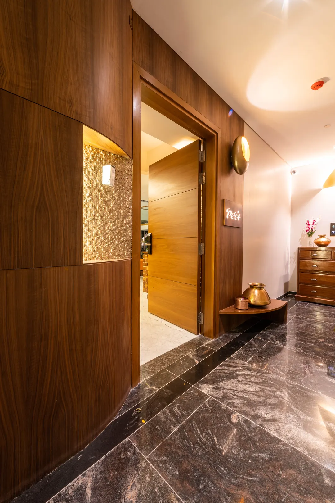 Natural materials like stone and brass were used as accents and walnut finish was chosen for the woodwork to create a warm interior.