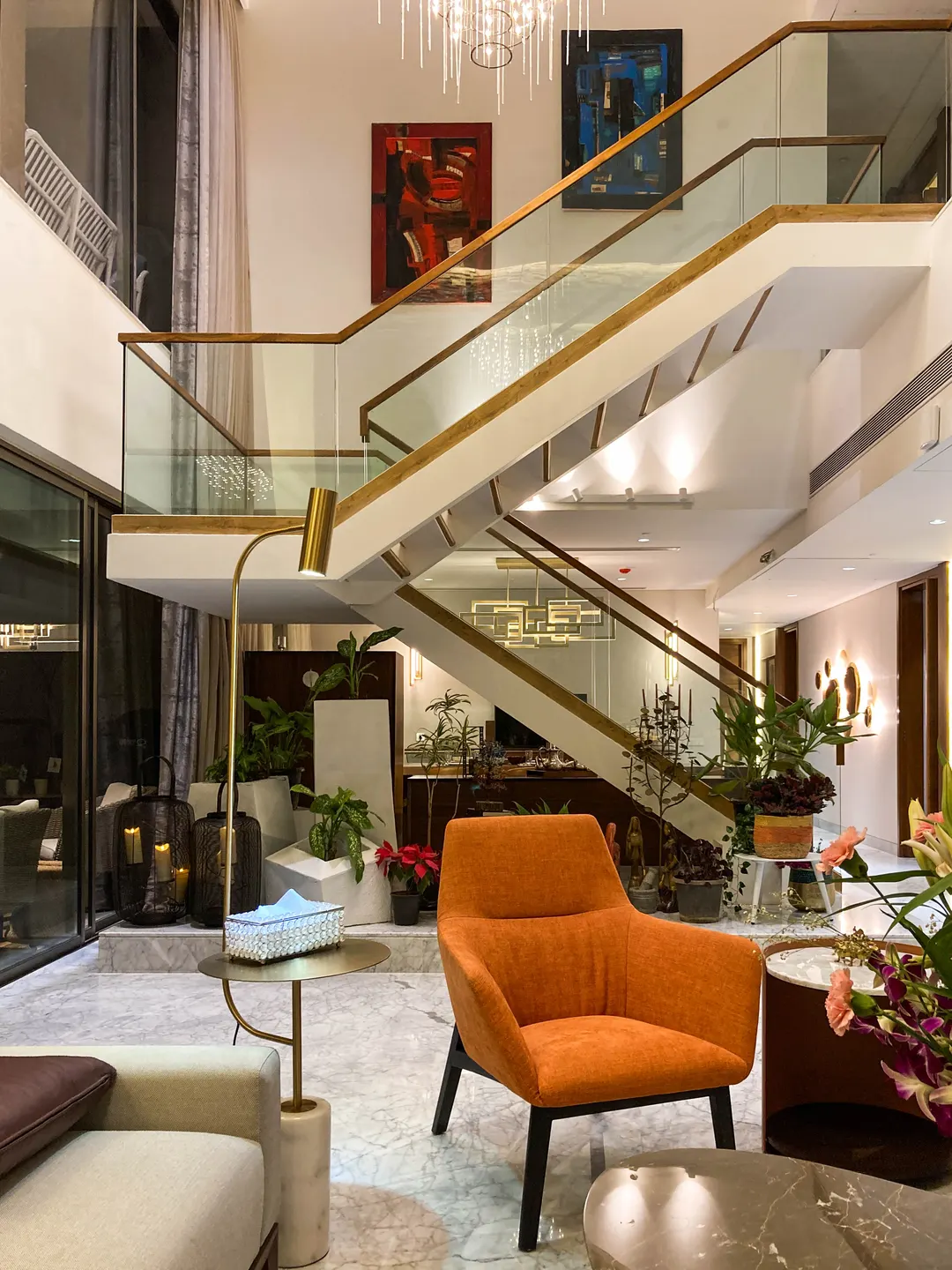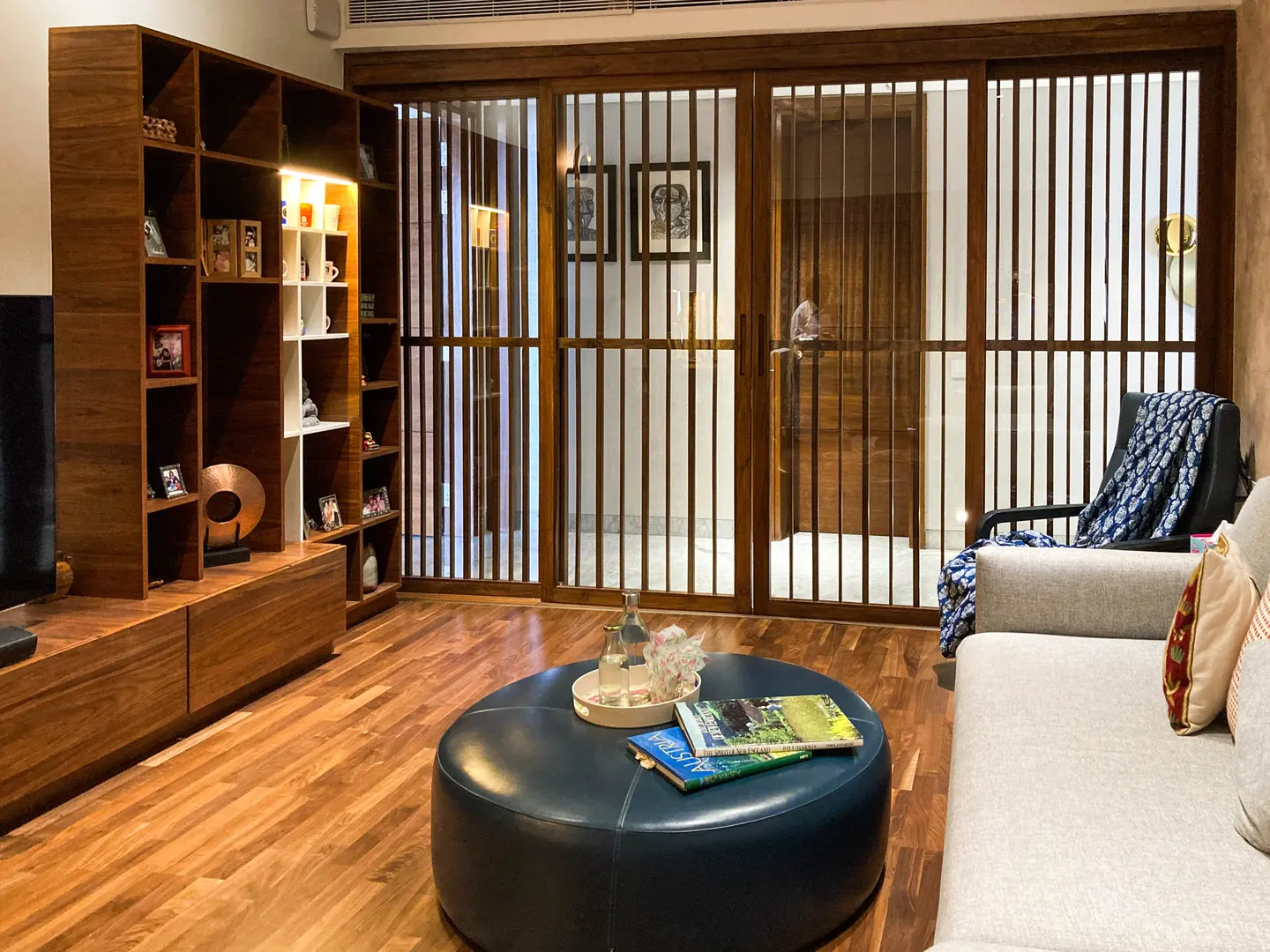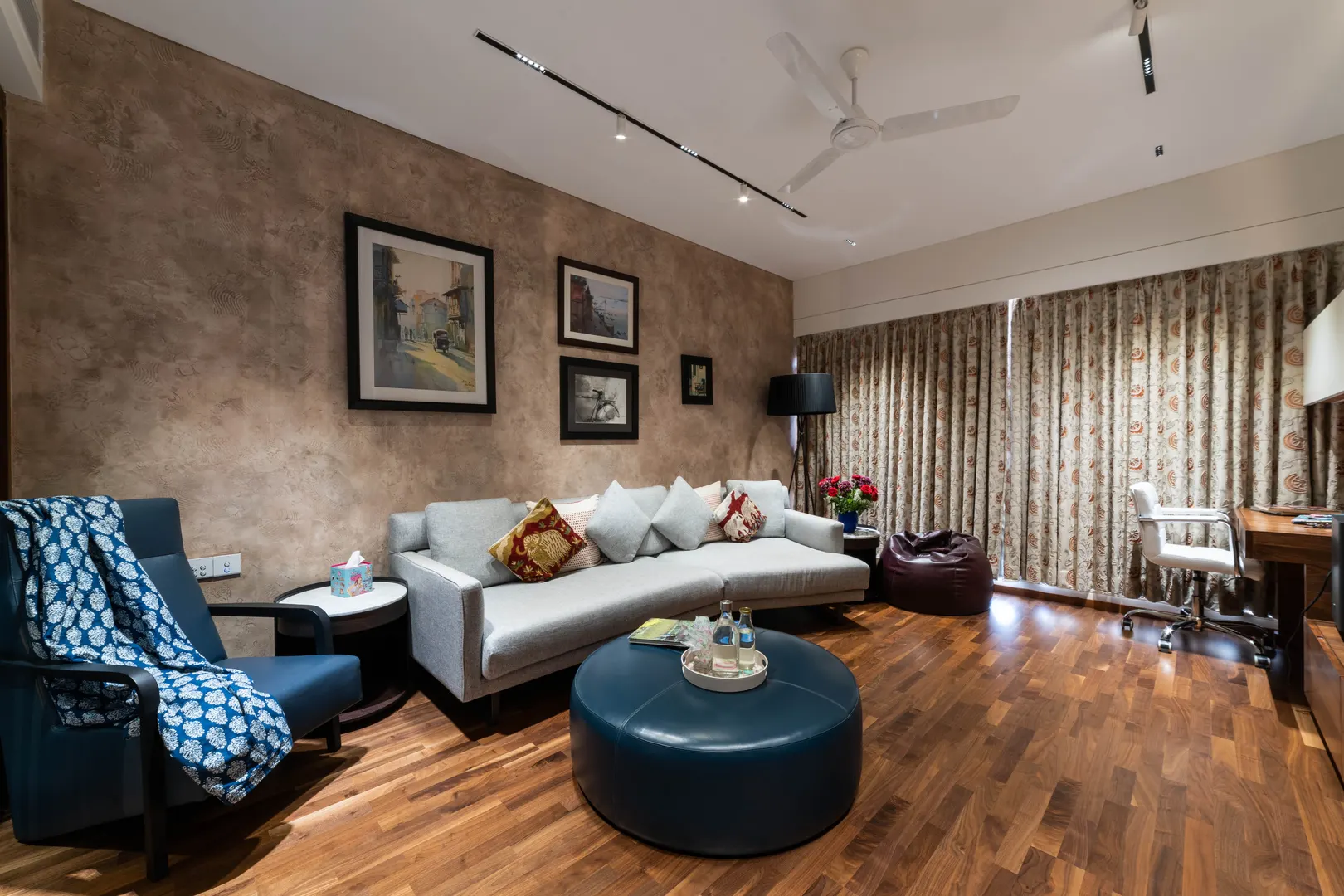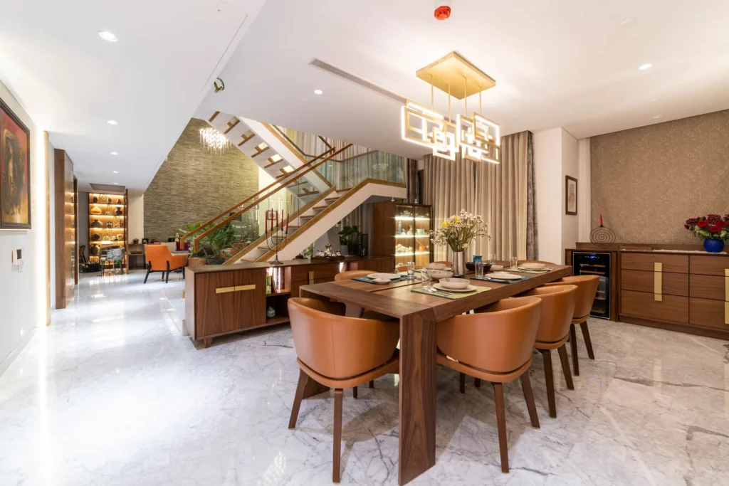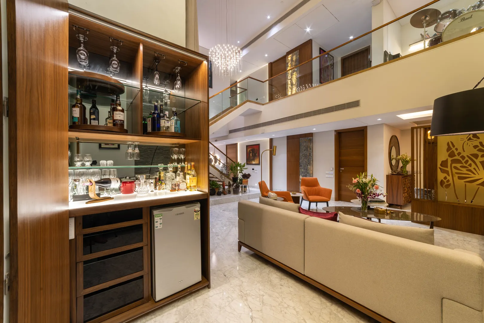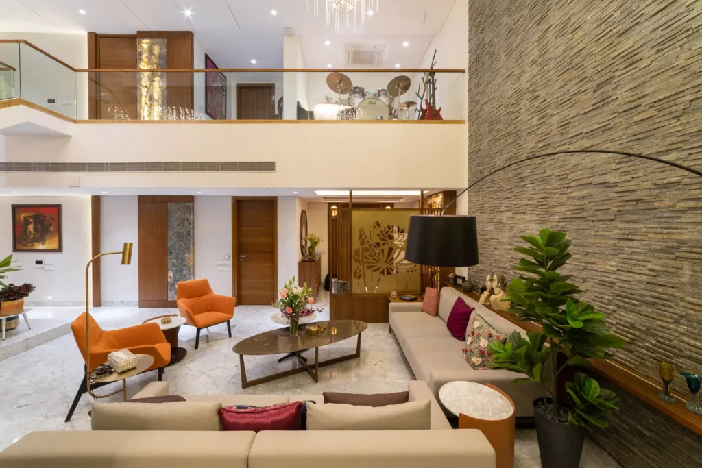 Two apartments on the 14th & 15th floor of this high-rise residential tower in Pune were redesigned as a duplex during the construction phase itself to create a spacious home for the client. Our concept was to design a home of understated elegance with a sense of spaciousness