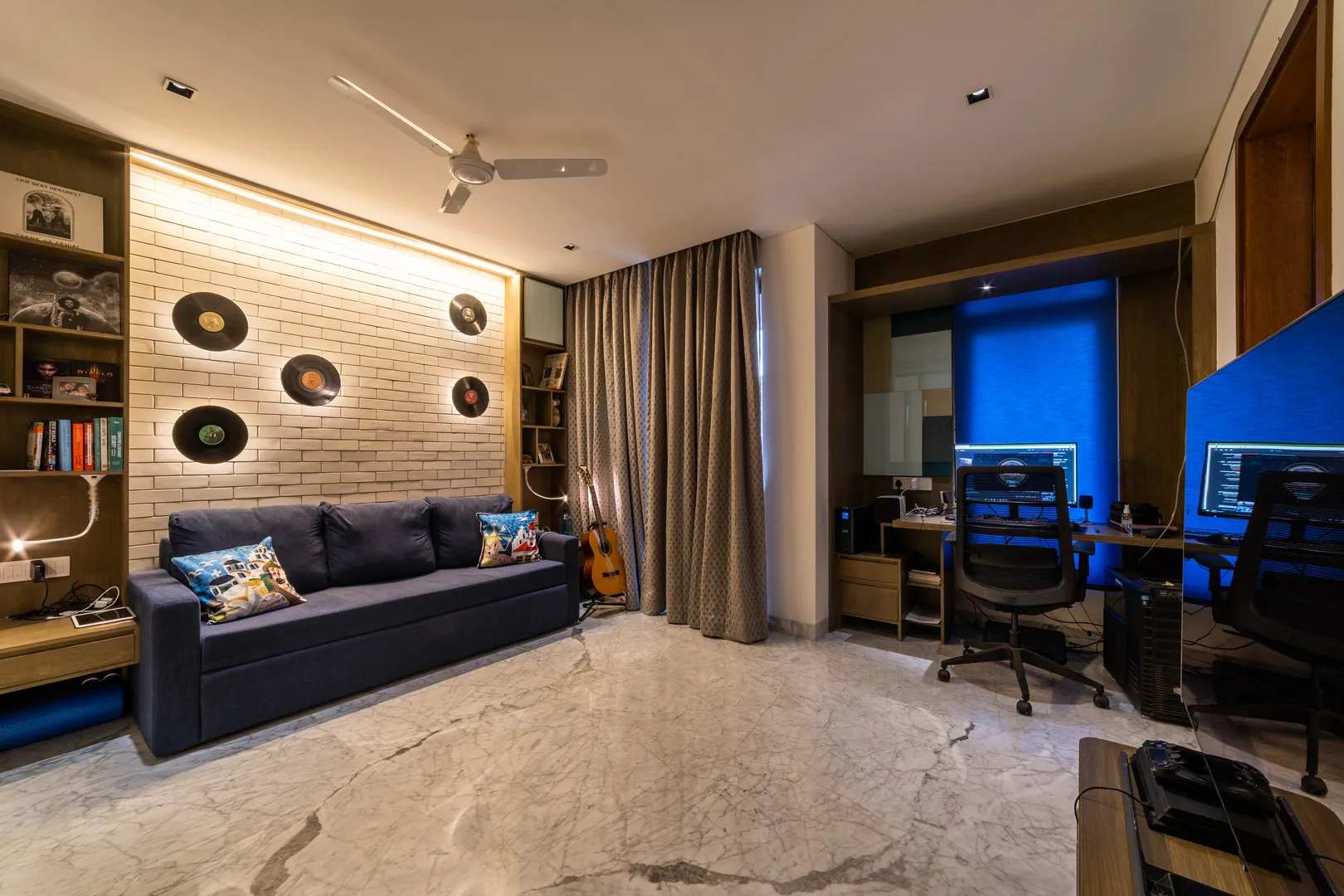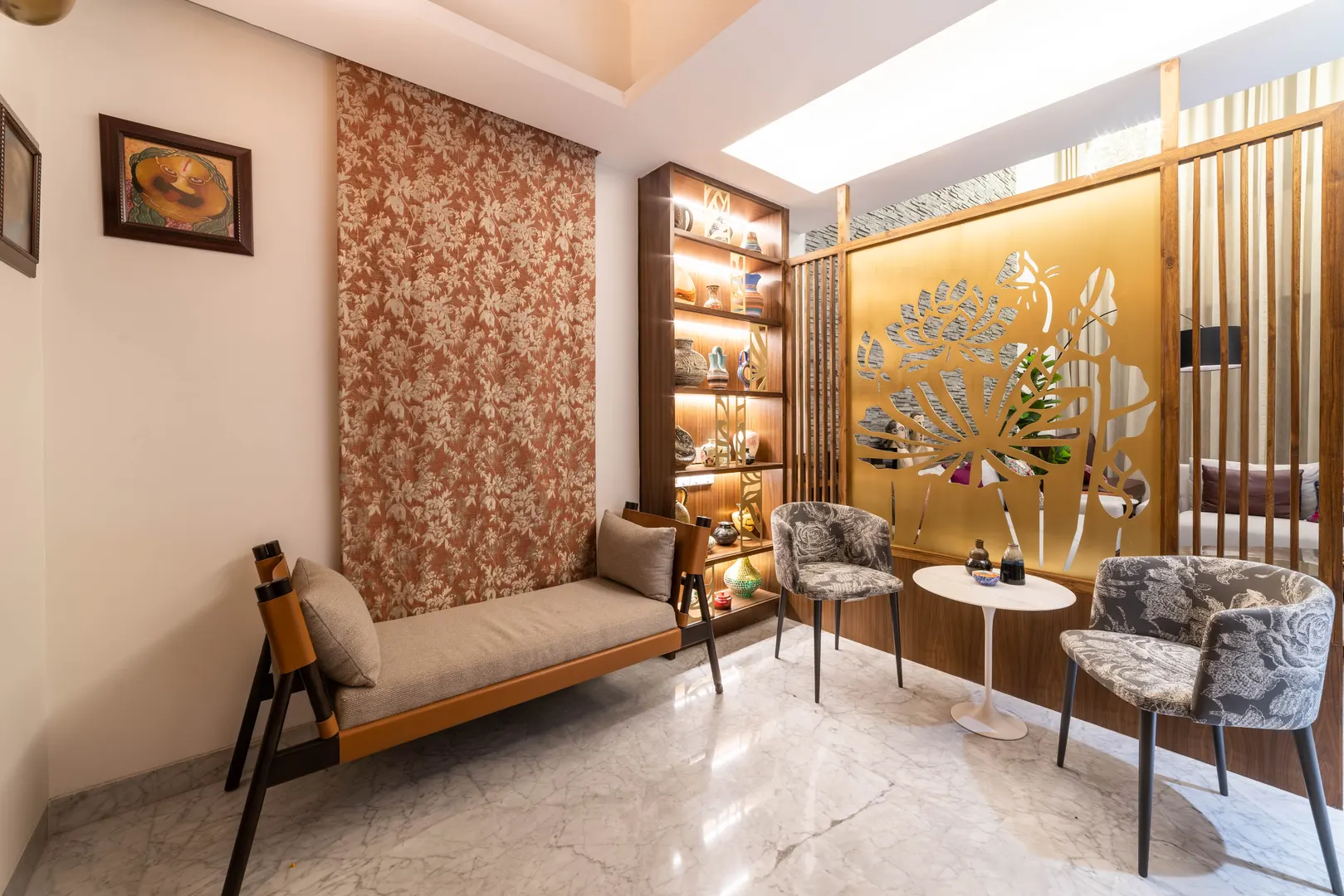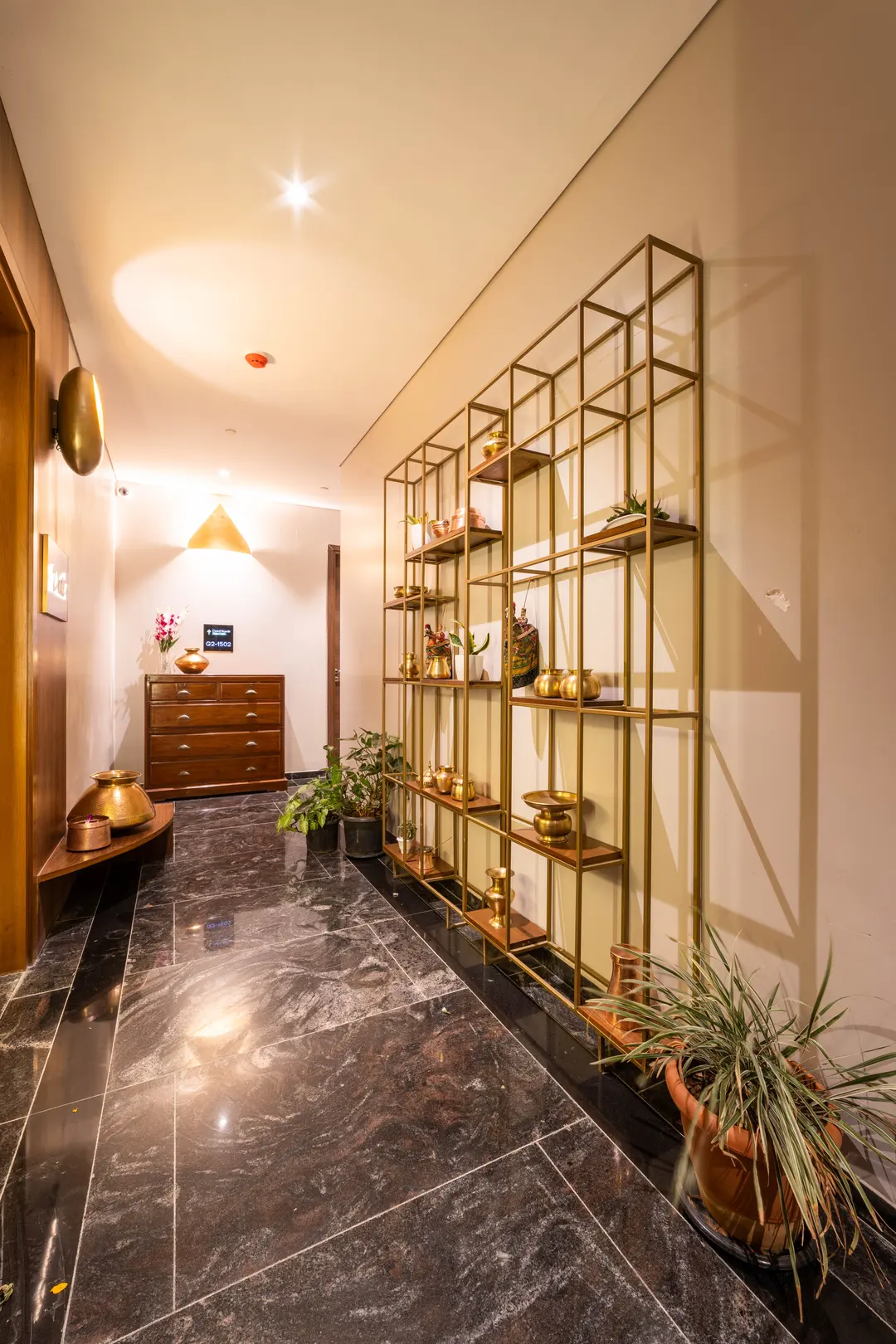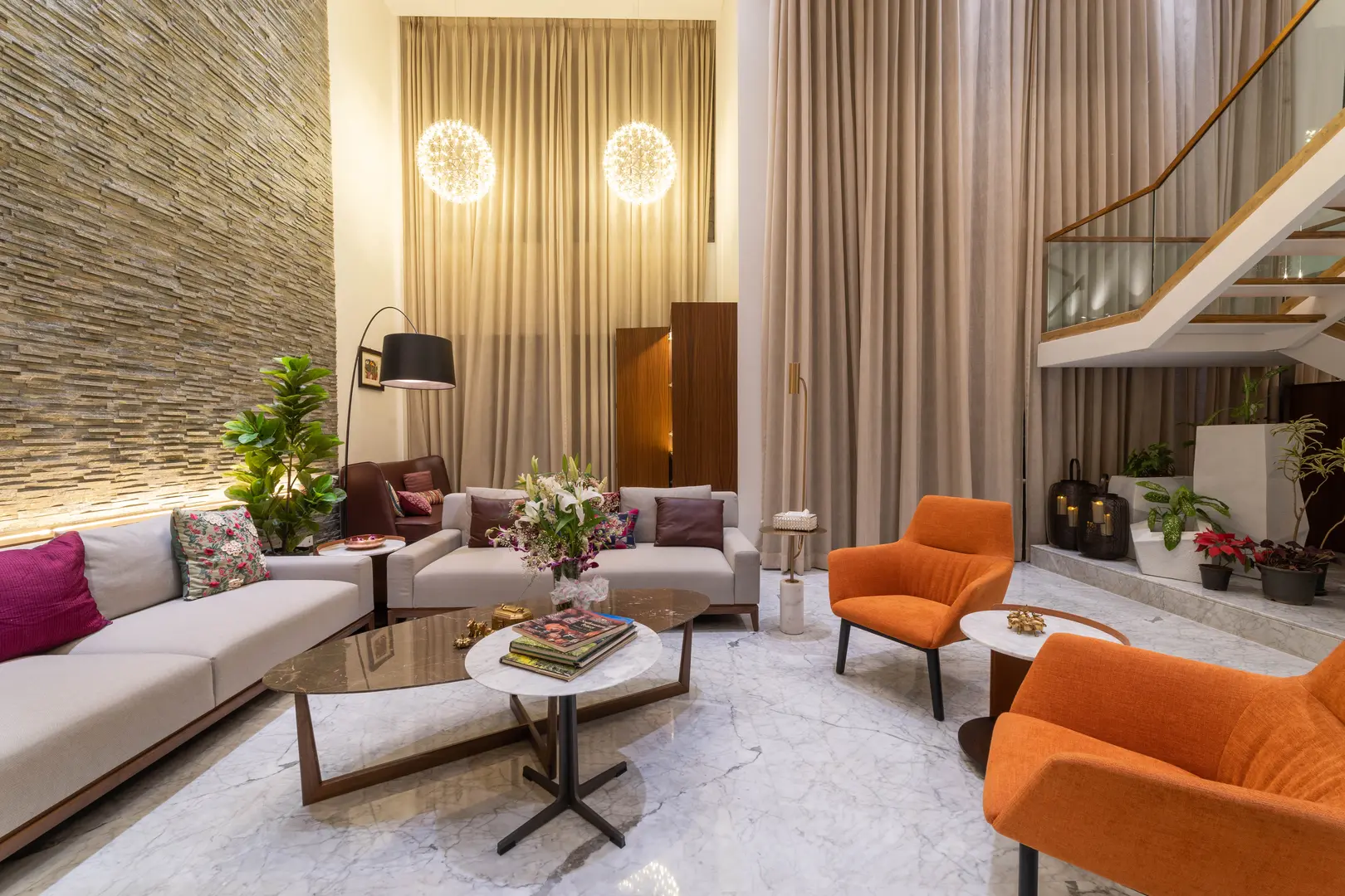 Two apartments on the 14th & 15th floor of this high-rise residential tower in Pune were redesigned as a duplex during the construction phase itself to create a spacious home for the client. Our concept was to design a home of understated elegance with a sense of spaciousness