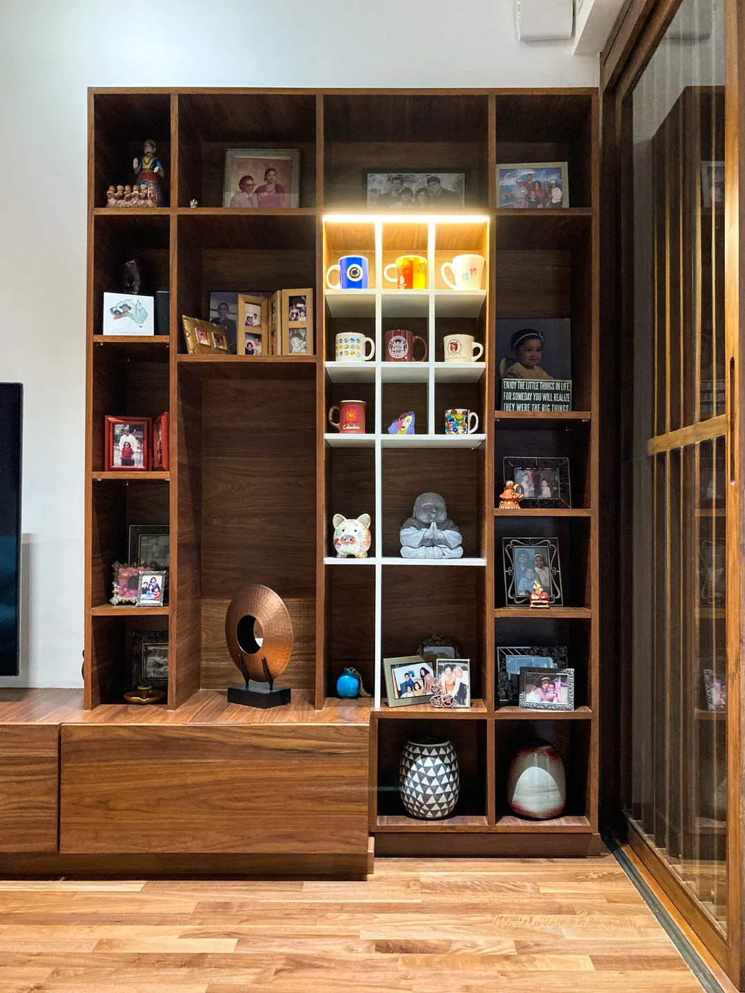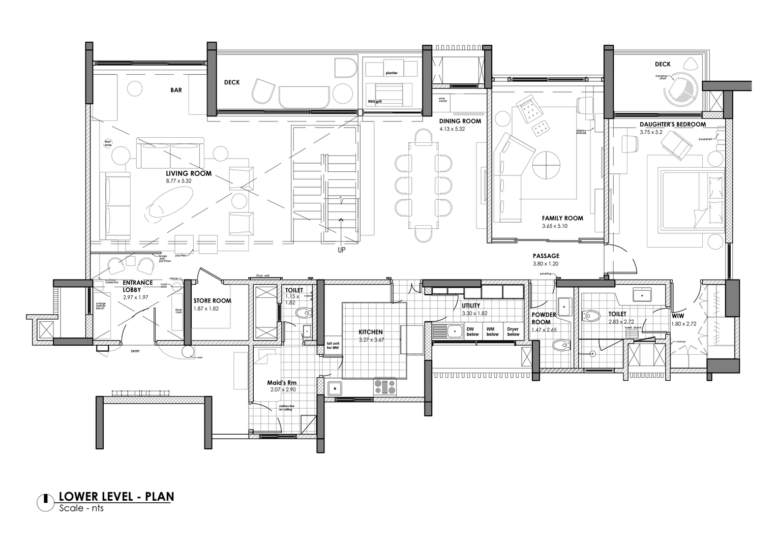 The intent was to have a more elaborate and opulent interior in the more public spaces of the lower level. The entry lobby, living, dining area, powder room and the family retreat are unified by use of wood, brass, stone and smooth finish wall paper. At the same time the owner’s collections of curios and items were highlighted to provide a personal touch to the spaces.