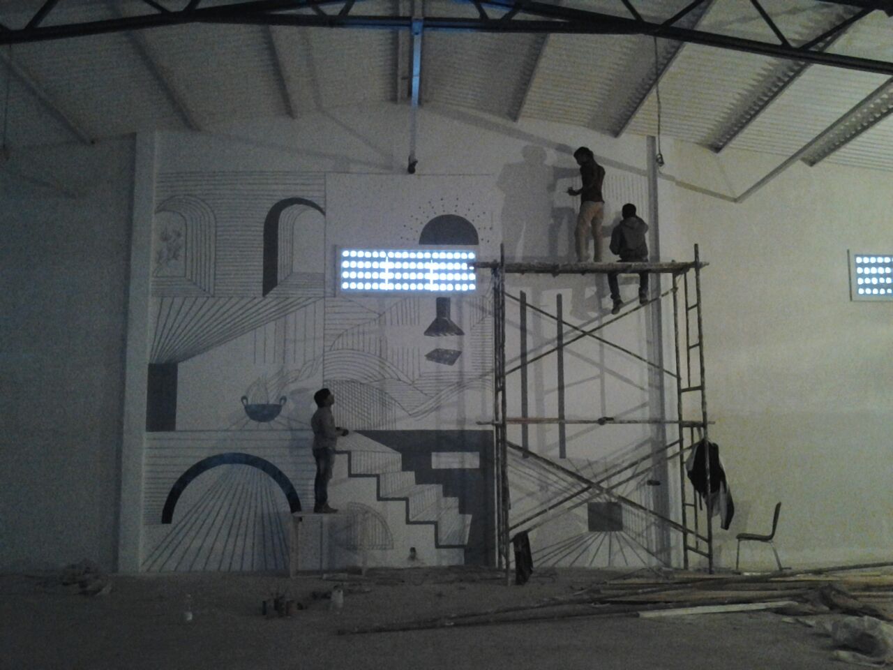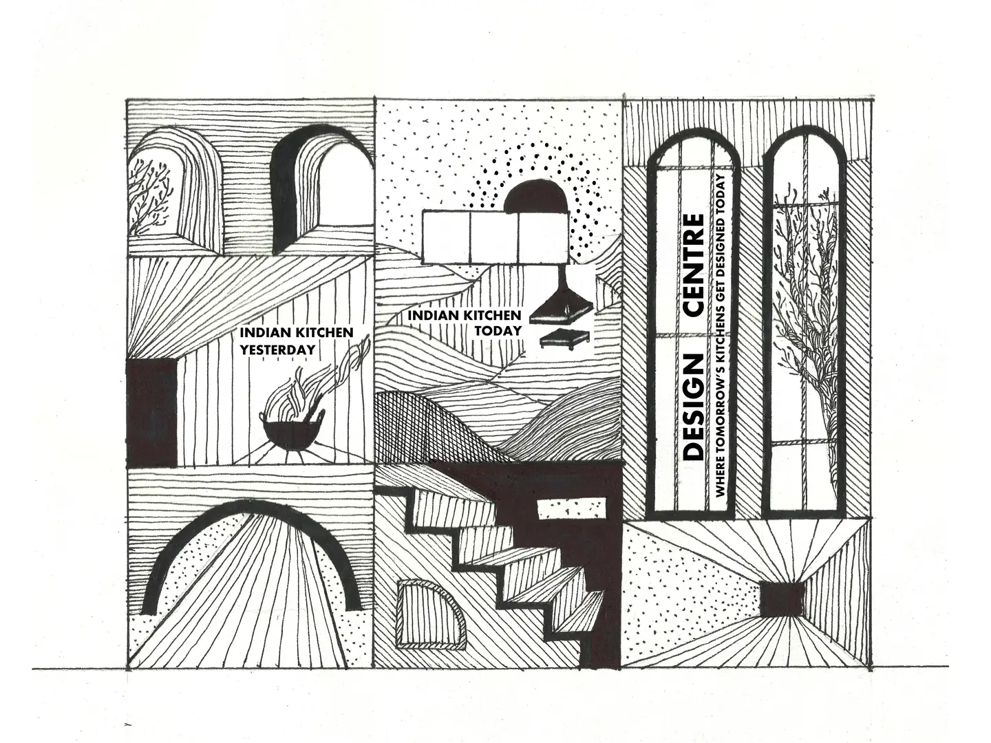 Sleek wanted the internal space to adapt to their evolving needs so we left the central space empty for their experimentation, displays etc. The rear wall had a painted mural that defined the raison d’etre of the Design Centre: the place where tomorrow’s kitchens get designed today. A local artist painted the mural designed by us on the rear wall as well as the paint on the shutters. The large custom-made light fittings tied the scattered space together.