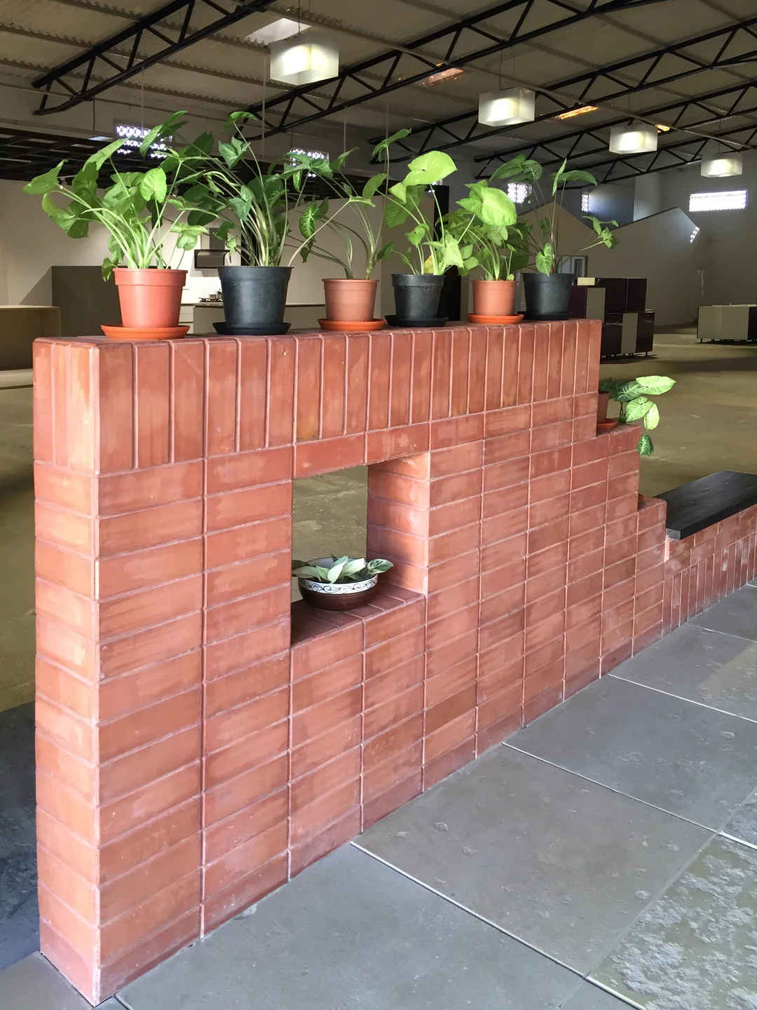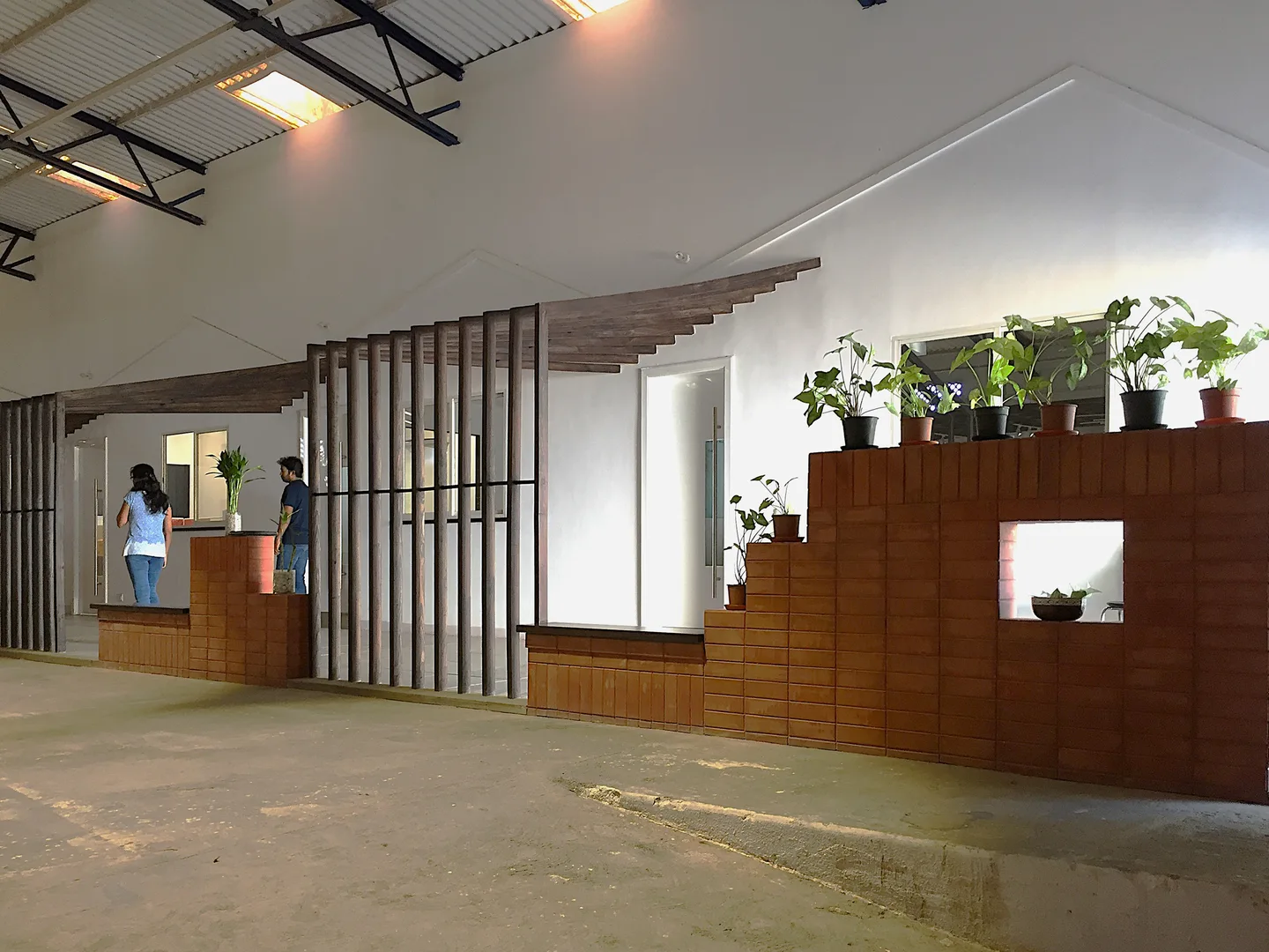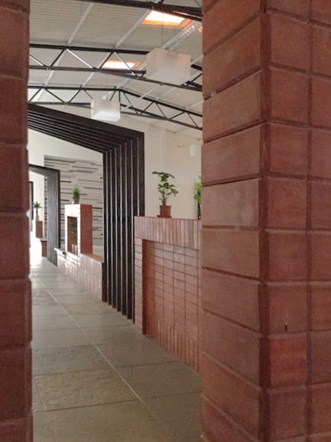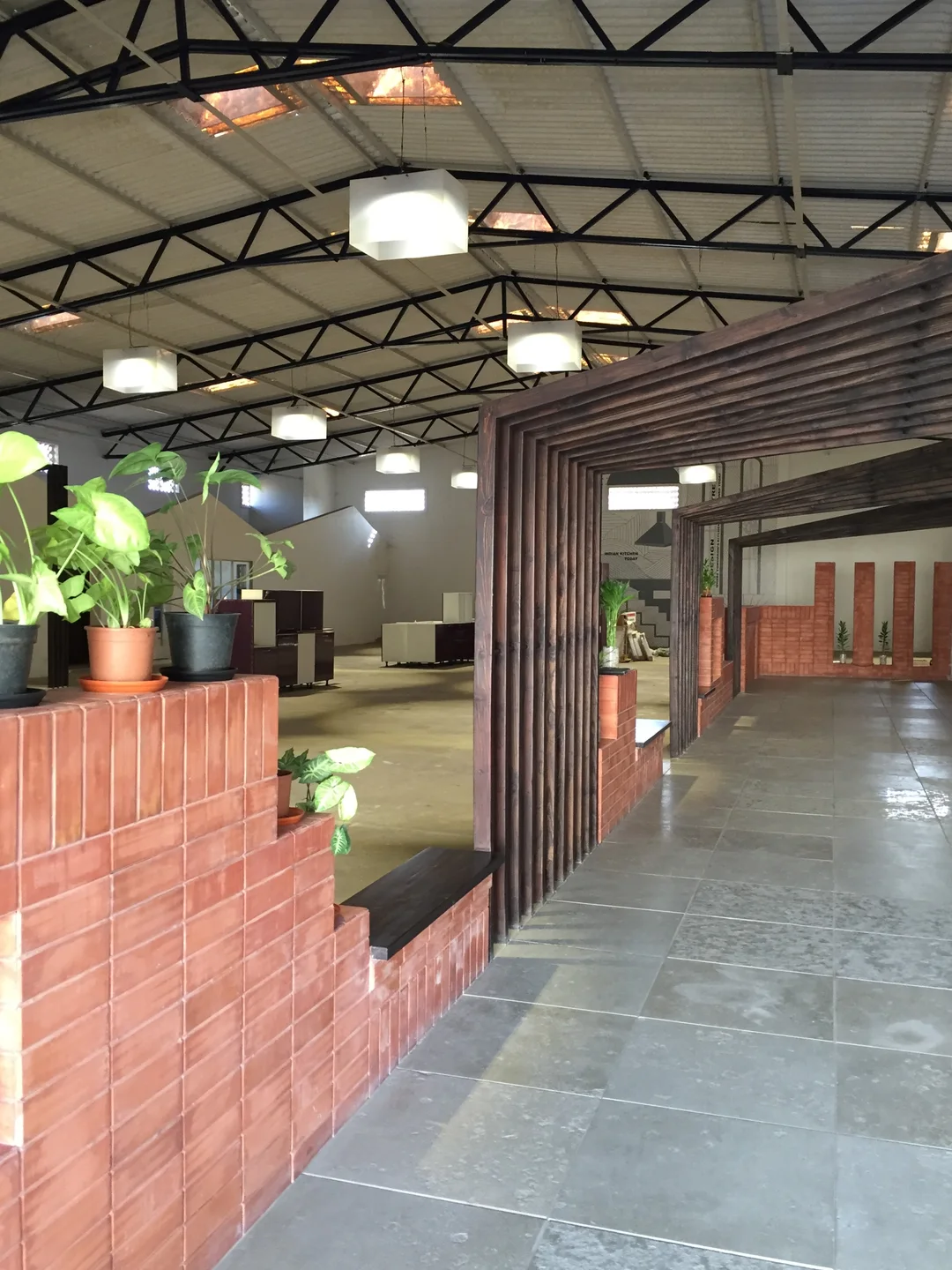We arrived at the design brief in consultation with the MD, where he felt, that along with work areas, spaces to bring people together to discuss ideas was much needed. That’s where the idea of the street adjacent to the work spaces was evolved. A place for chai and chats- a place which fosters innovation through interaction, a place where tomorrow’s kitchens get imagined today. The street edge, defined by a brick wall, had plants, benches on the street wall. Thresholds to each of the work spaces were defined by the wooden trellis. The paving, the stepped brick wall, the undulating wooden canopies, the seats spaced along the street, plants on the wall- the street articulates a place of coming together within this large volume.