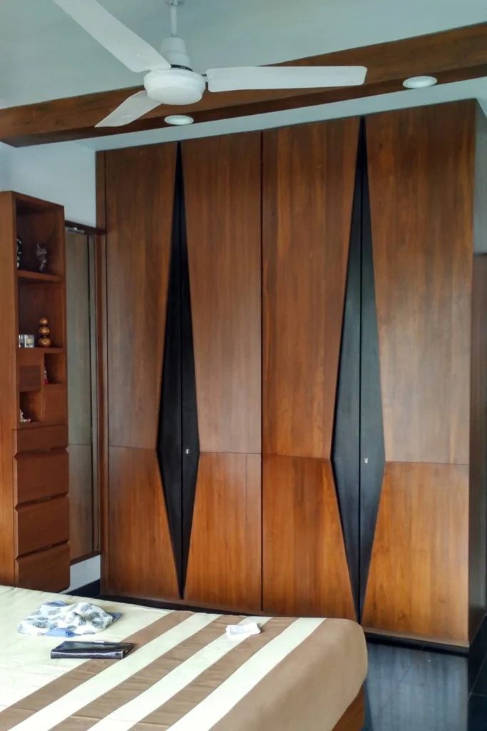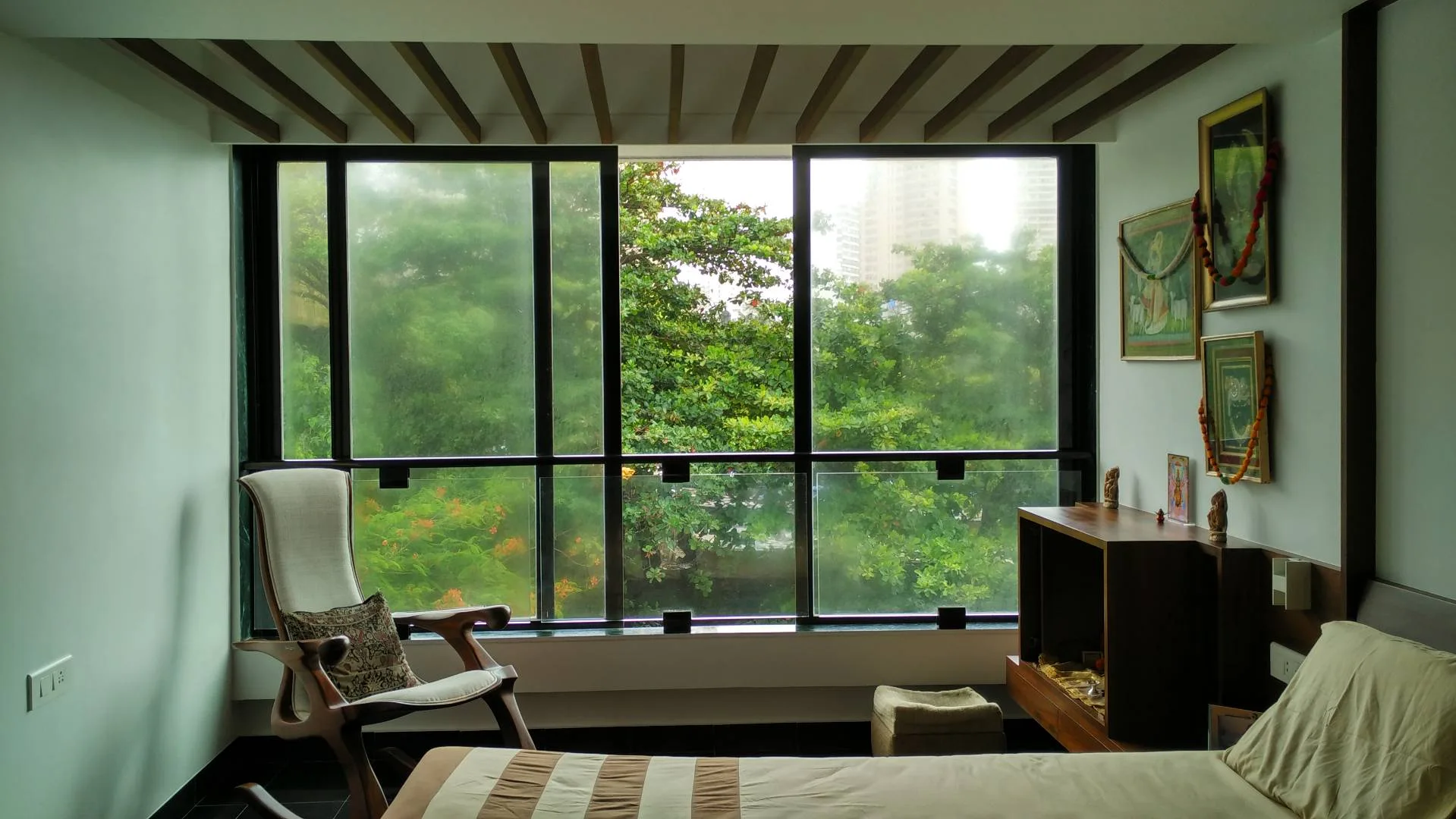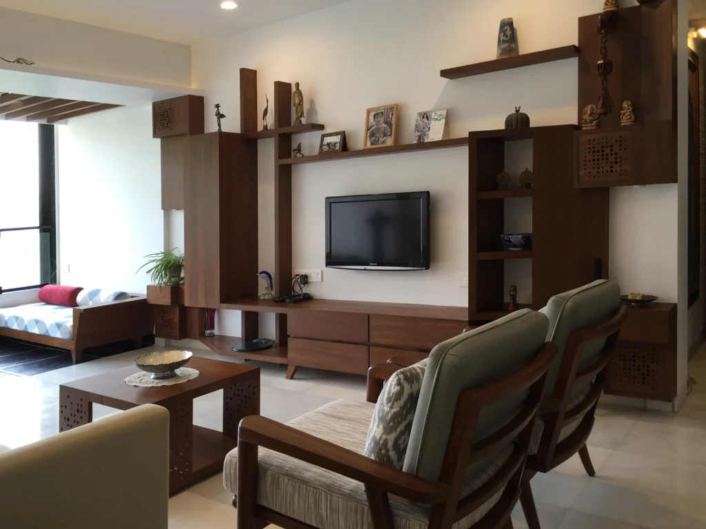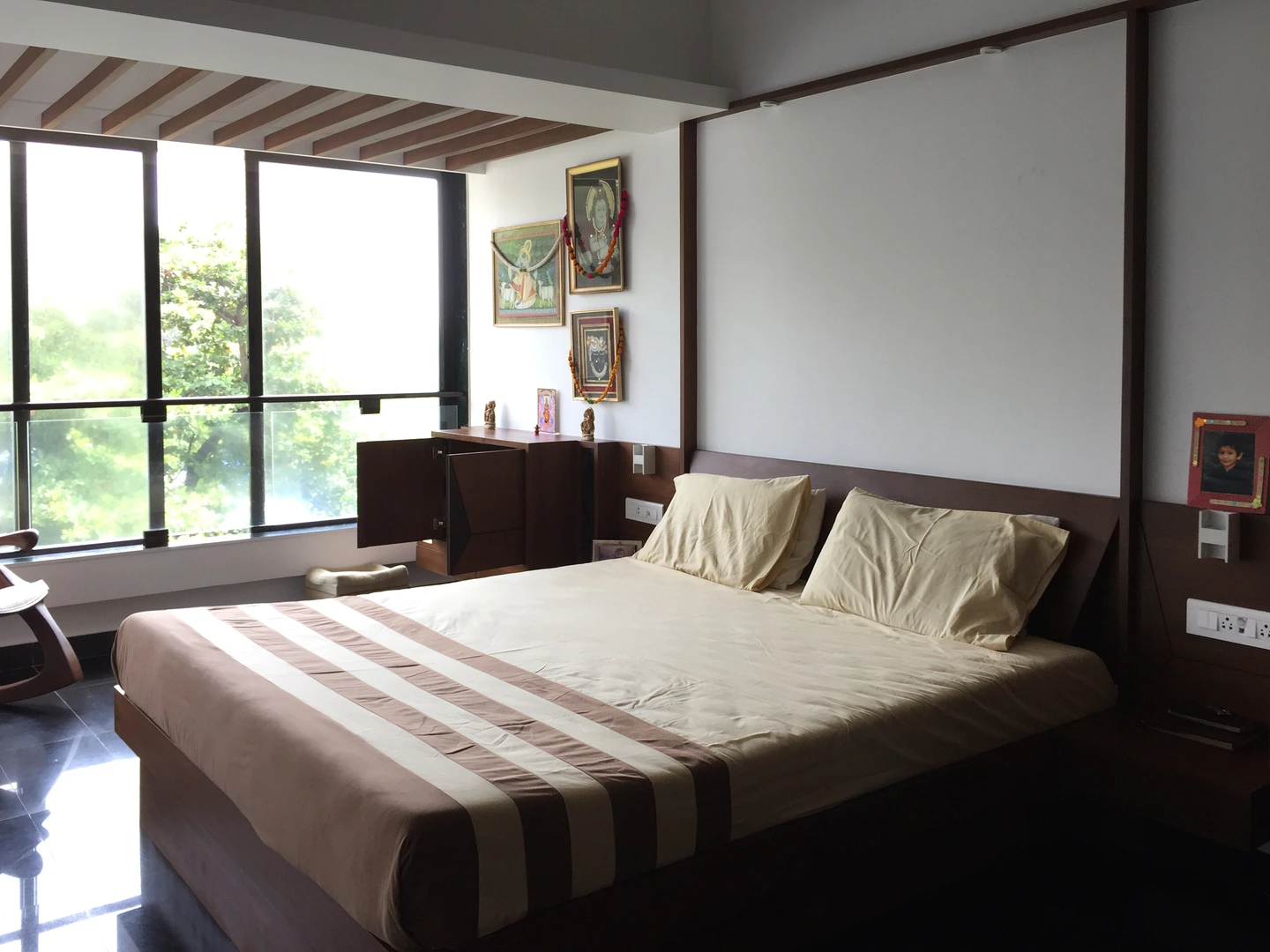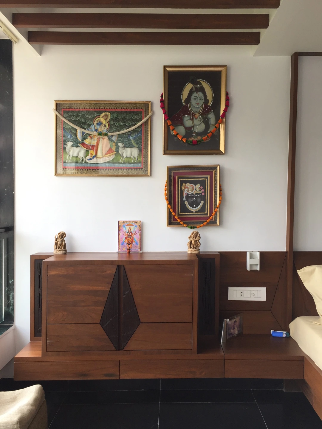 The rest of the furniture was sourced from a local designer store and complimented the neutral earthy look. The custom-made wardrobe has a three-dimensional handle crafted in the same wood, the mandir along the bedside is discreetly designed below the pichwais in the balcony area.