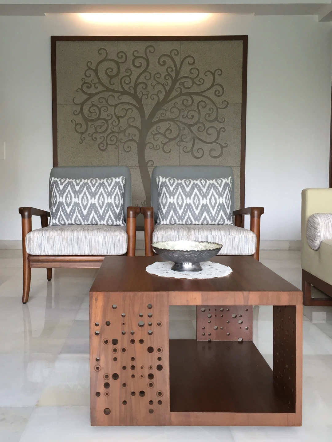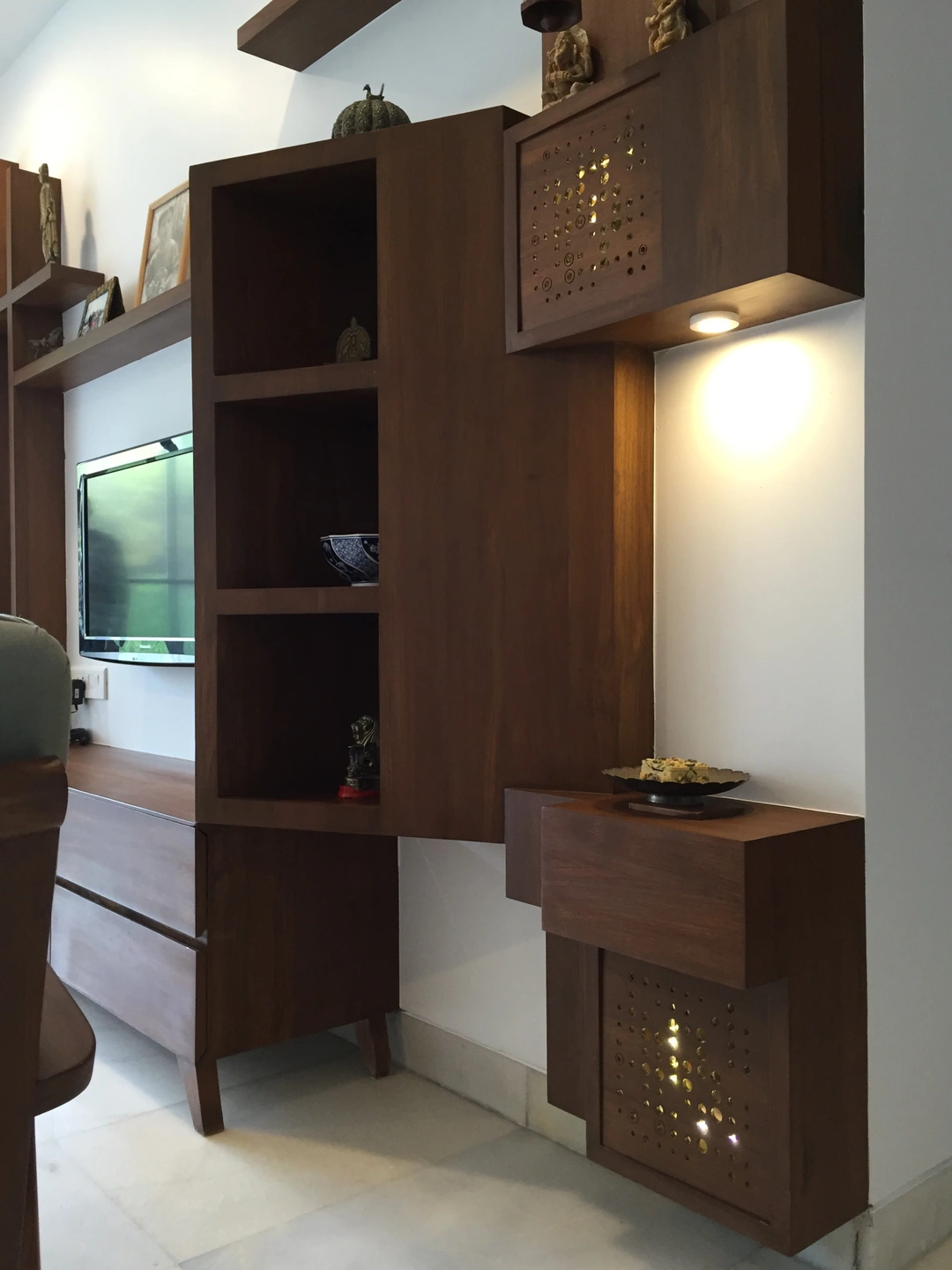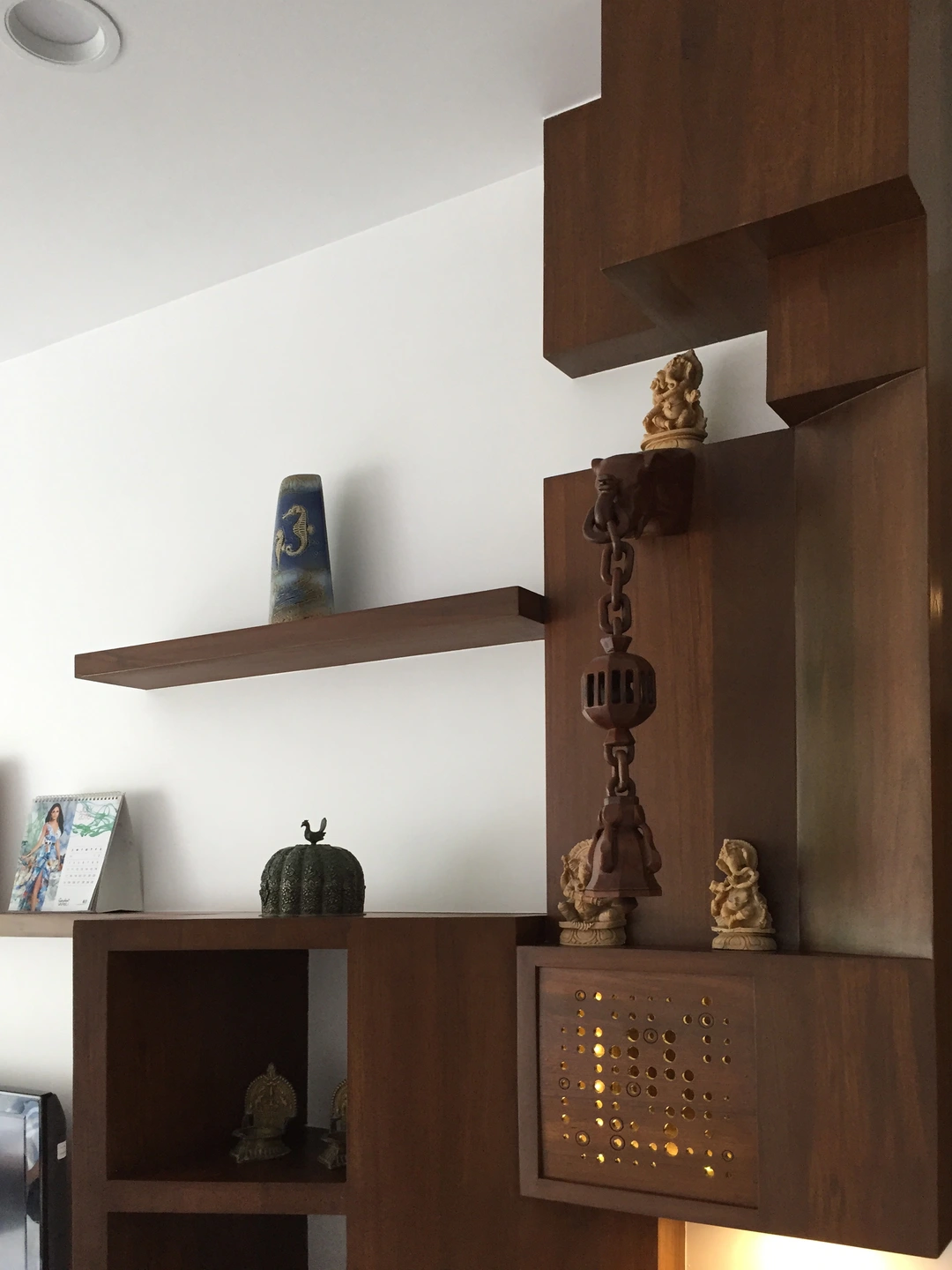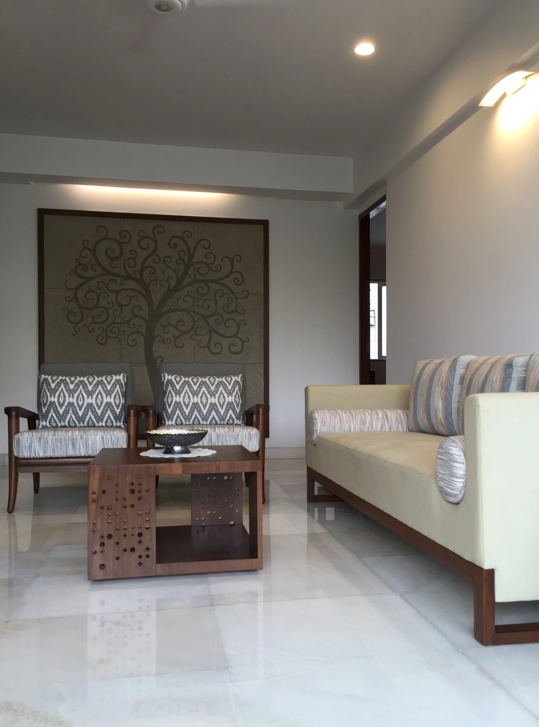 The rest of the furniture was sourced from a local designer store and complimented the neutral earthy look. The custom-made wardrobe has a three-dimensional handle crafted in the same wood, the mandir along the bedside is discreetly designed below the pichwais in the balcony area.