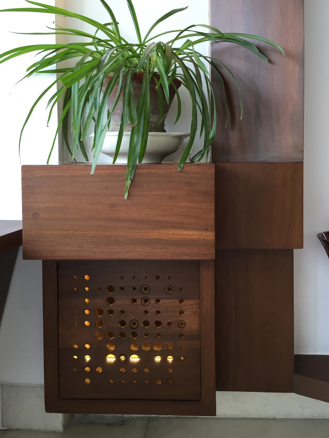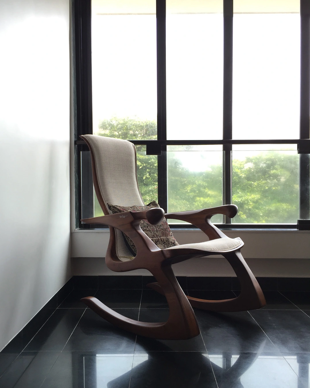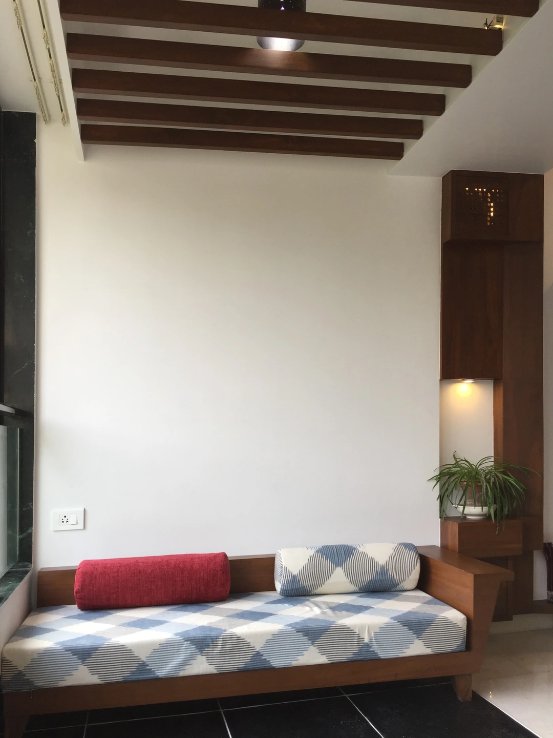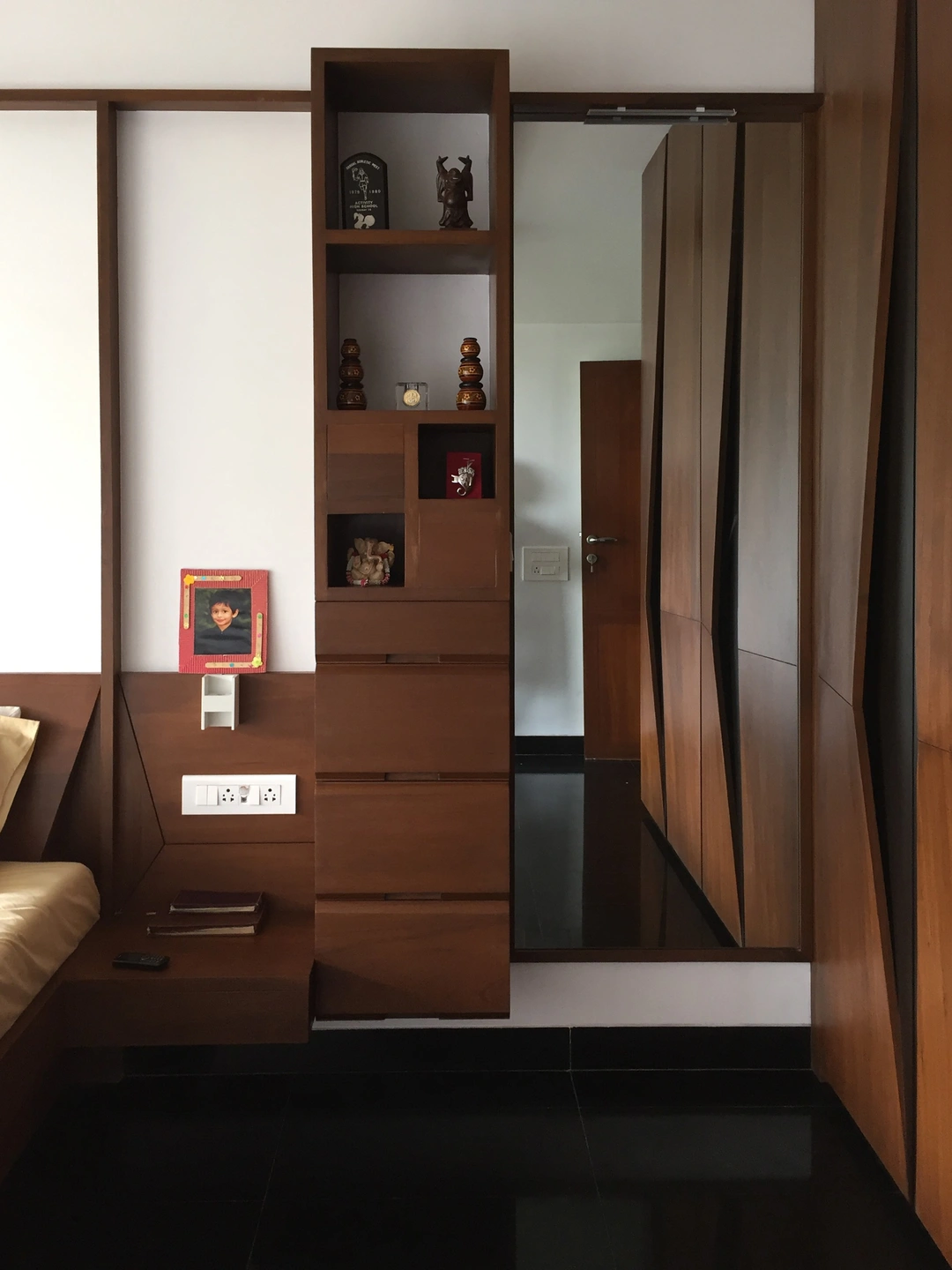 The rest of the furniture was sourced from a local designer store and complimented the neutral earthy look. The custom-made wardrobe has a three-dimensional handle crafted in the same wood, the mandir along the bedside is discreetly designed below the pichwais in the balcony area.