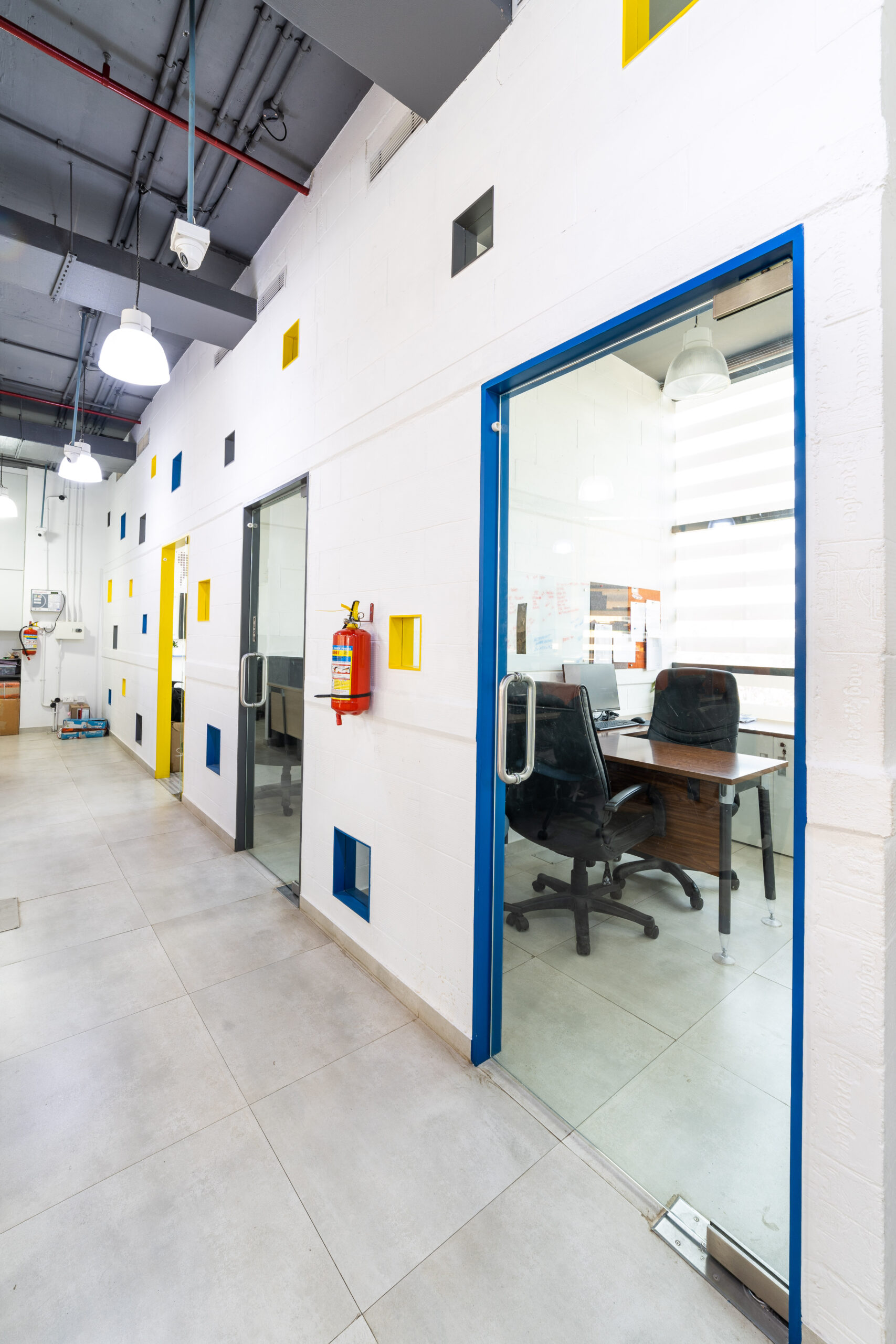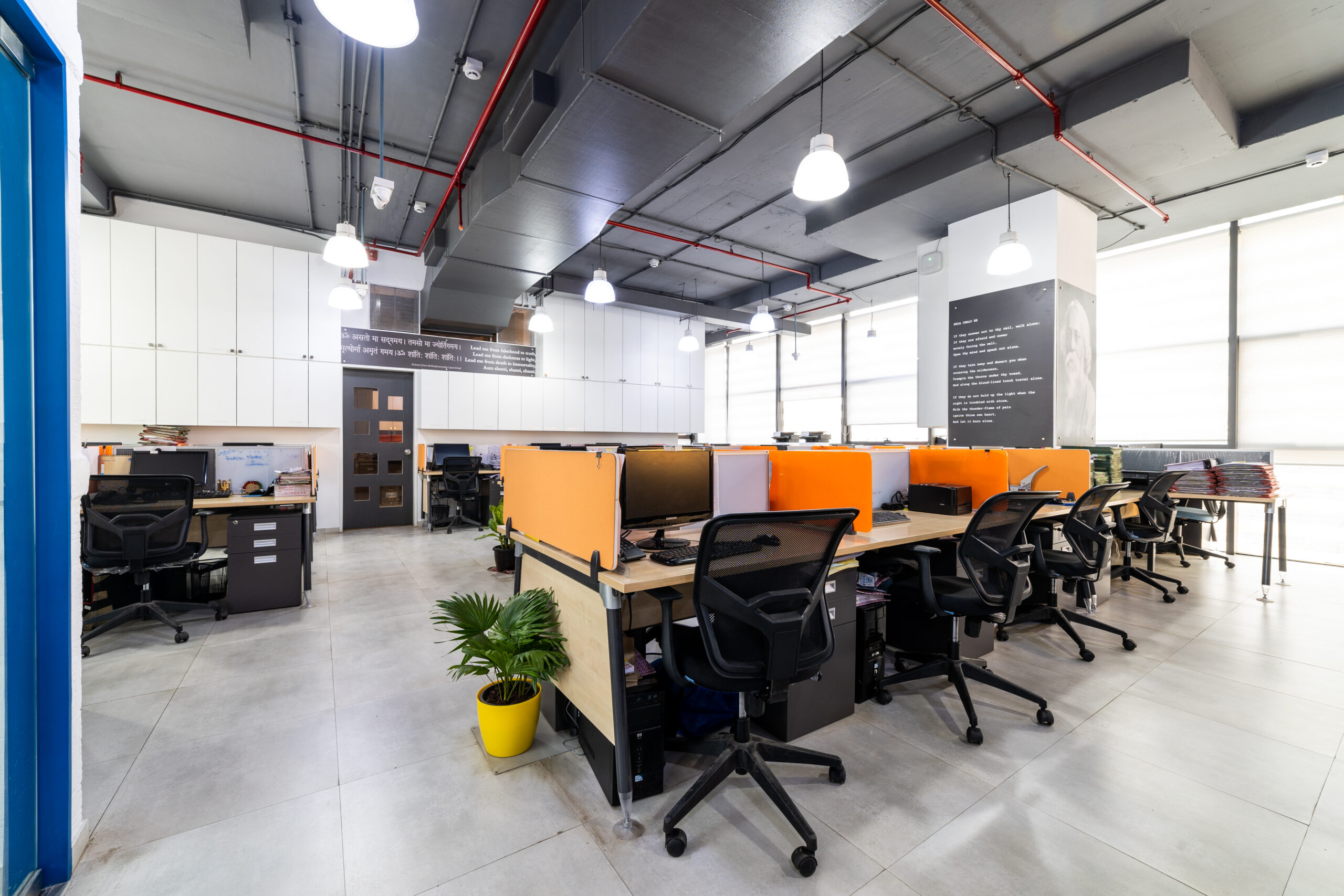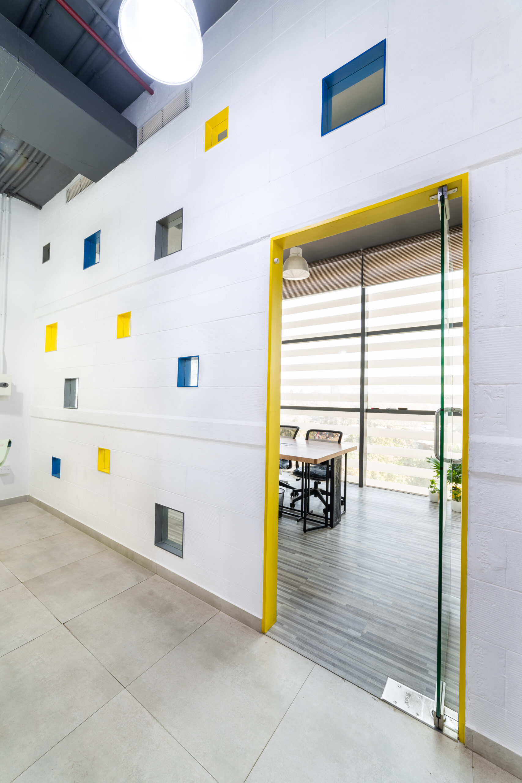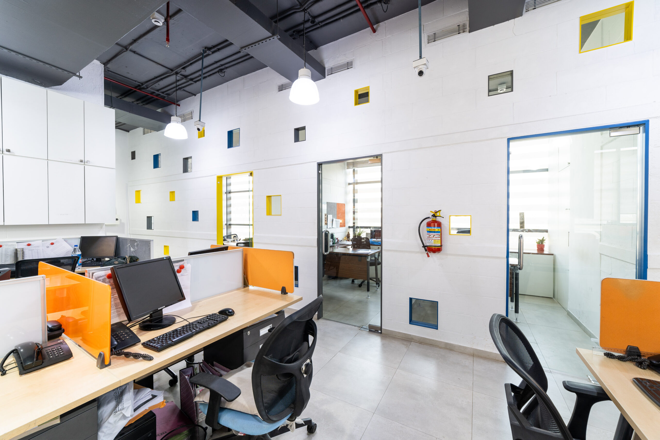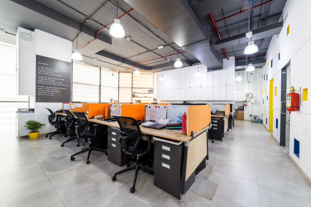 A marketing office for a logistics company strategically located near the International Airport, needed an office suitable to interact with their international clients. We designed the office in a contemporary industrial aesthetics, with exposed services, industrial light fittings, modular furniture.