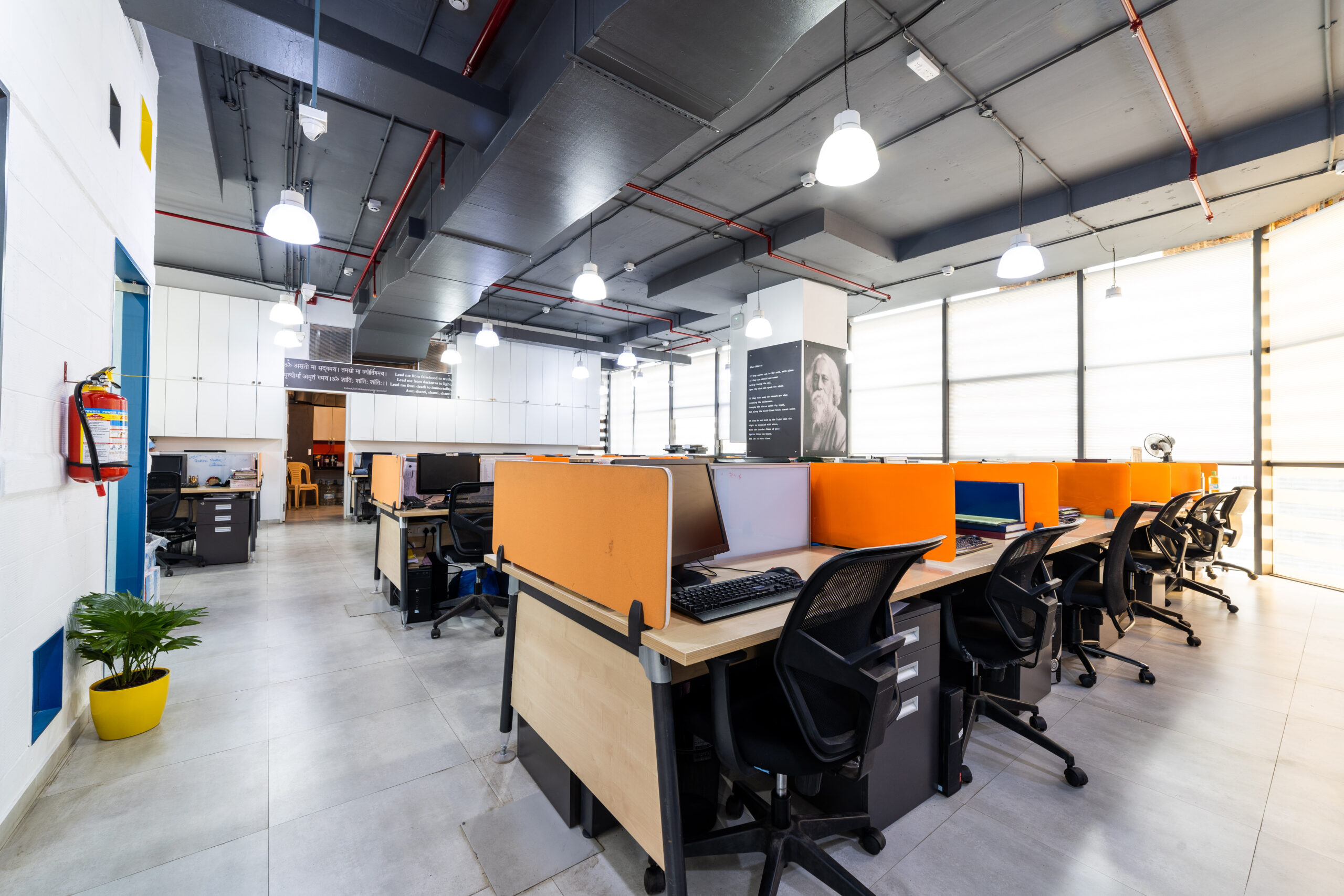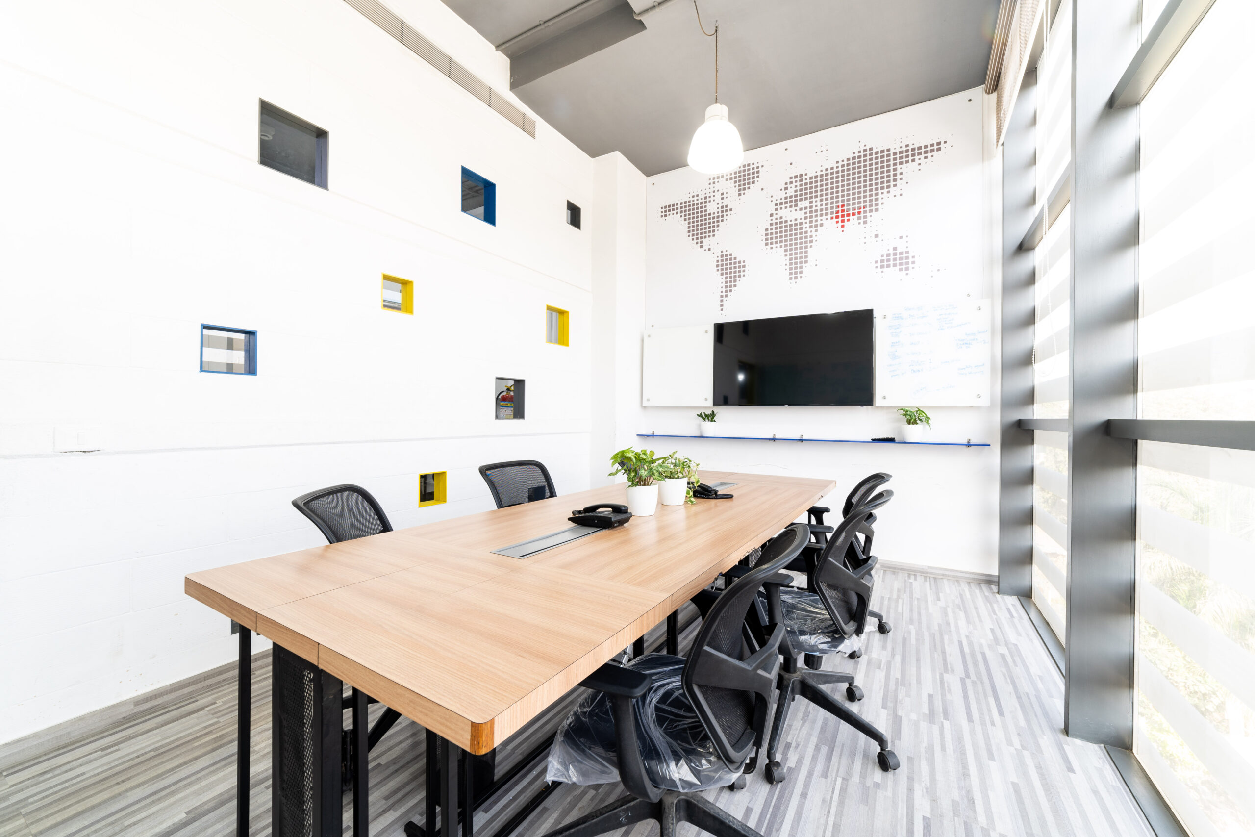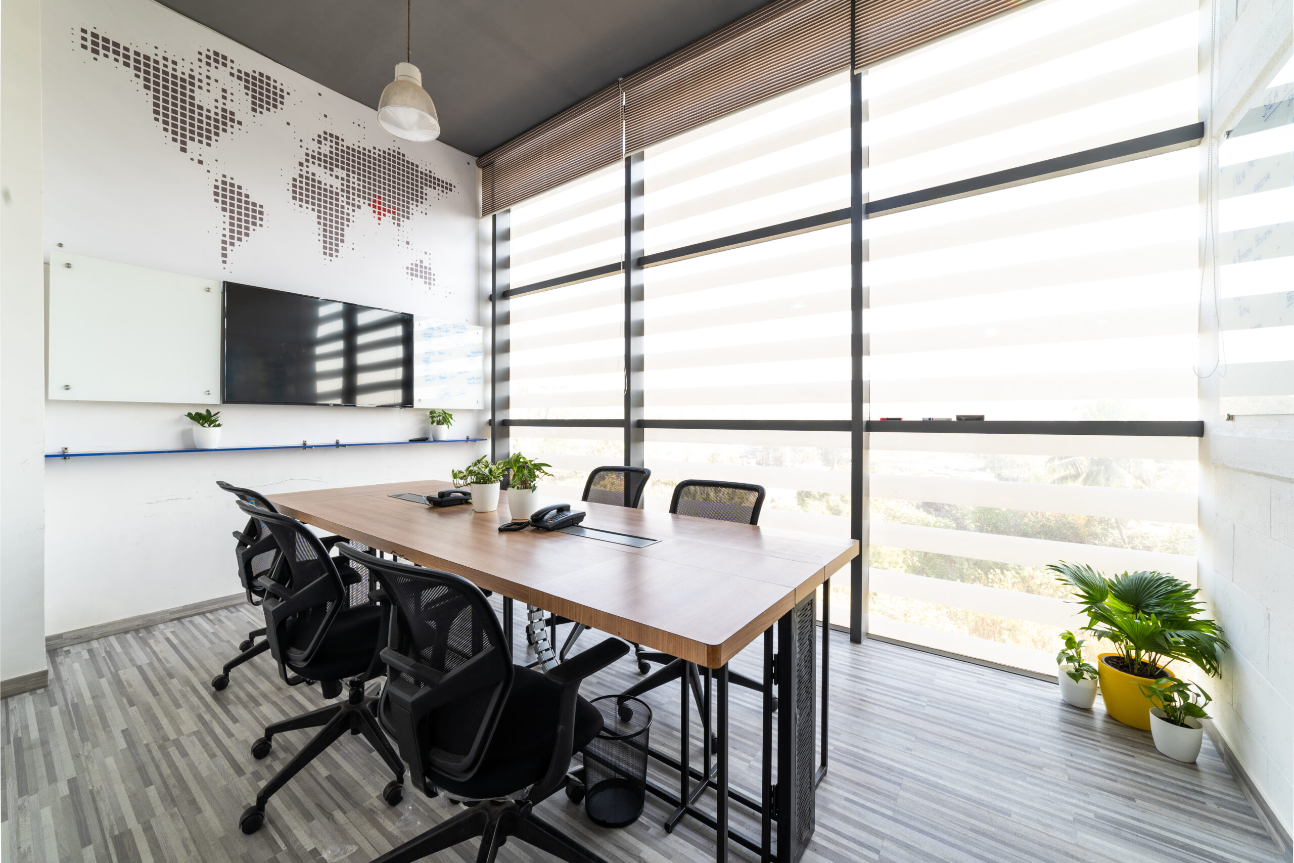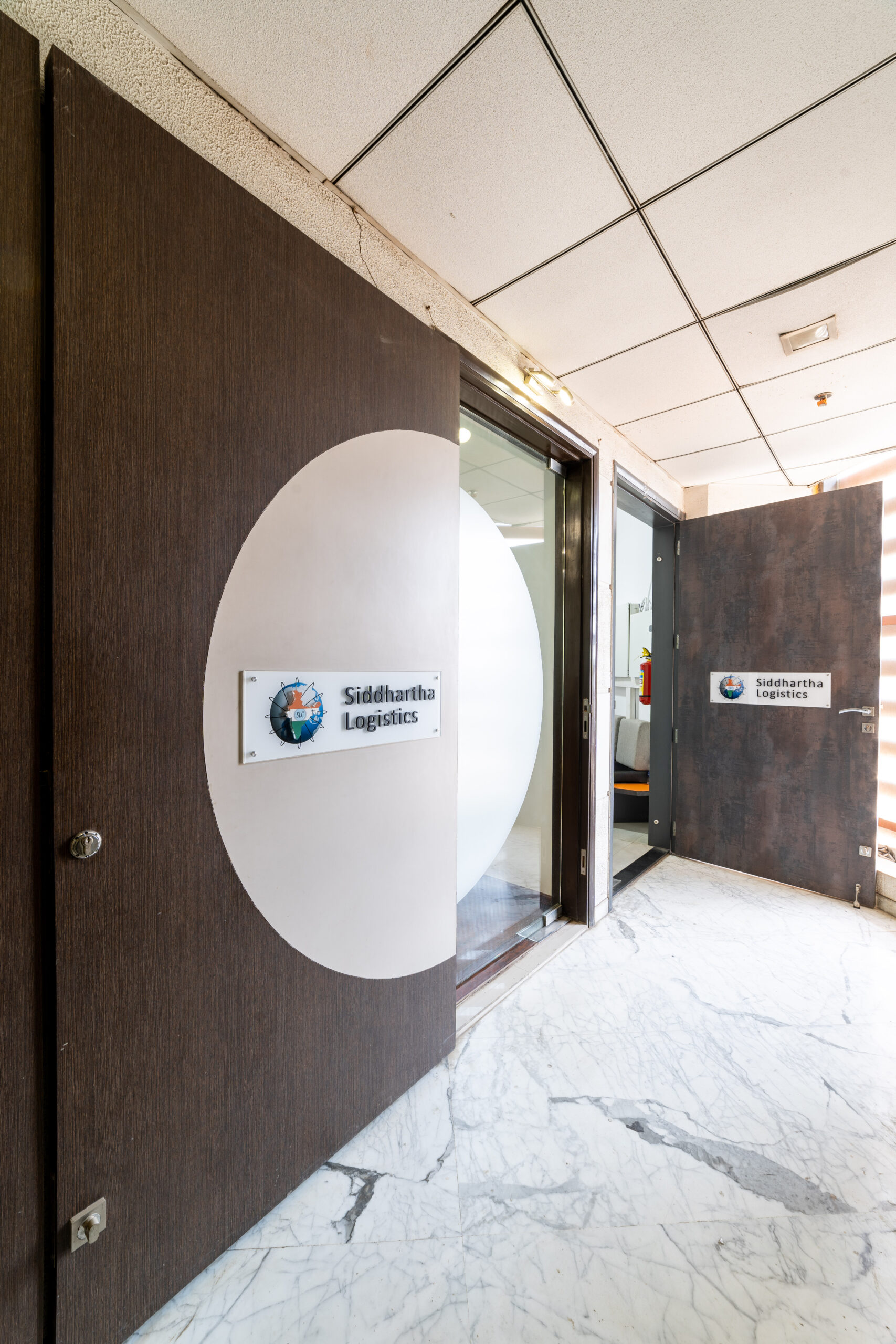 A marketing office for a logistics company strategically located near the International Airport, needed an office suitable to interact with their international clients. We designed the office in a contemporary industrial aesthetics, with exposed services, industrial light fittings, modular furniture.