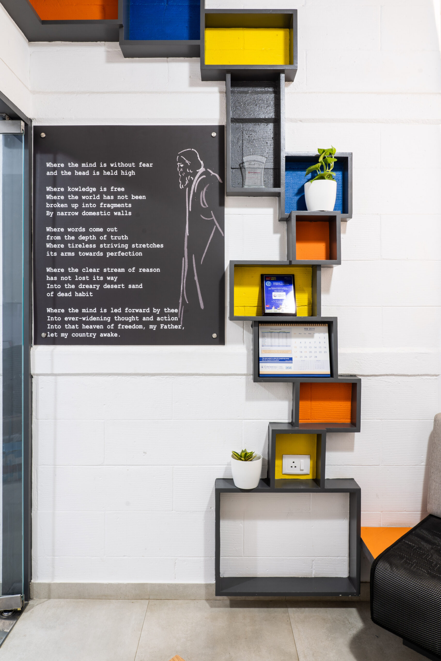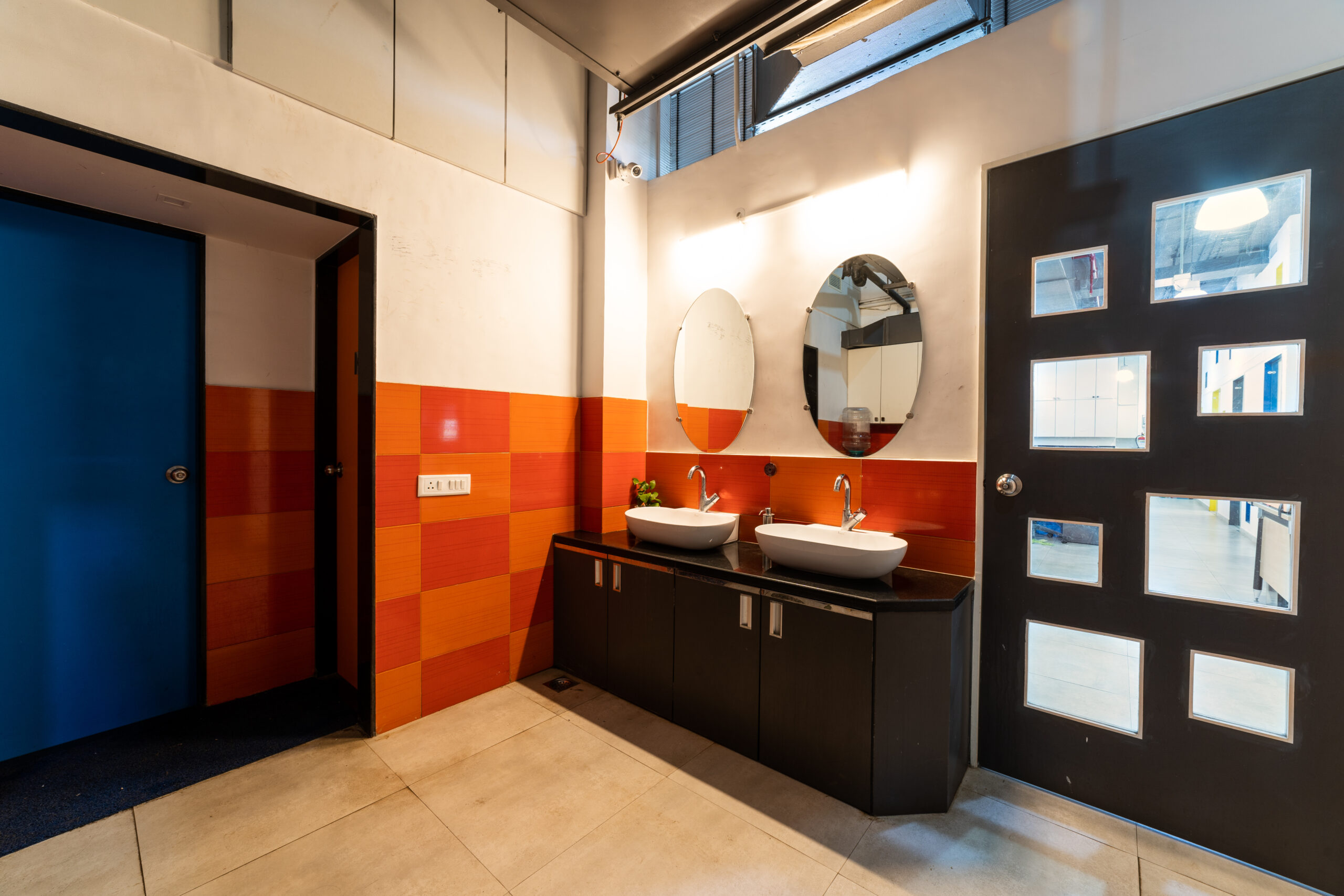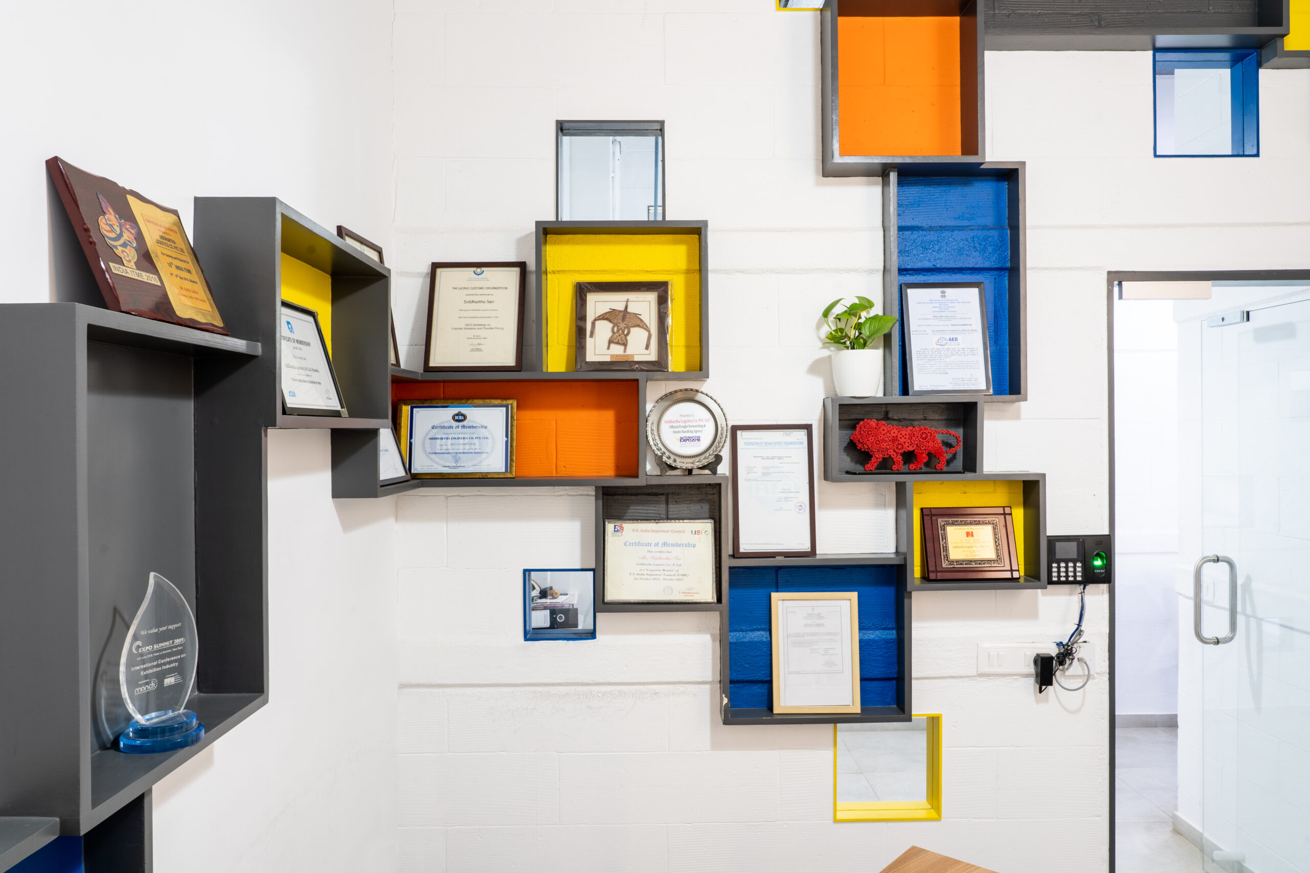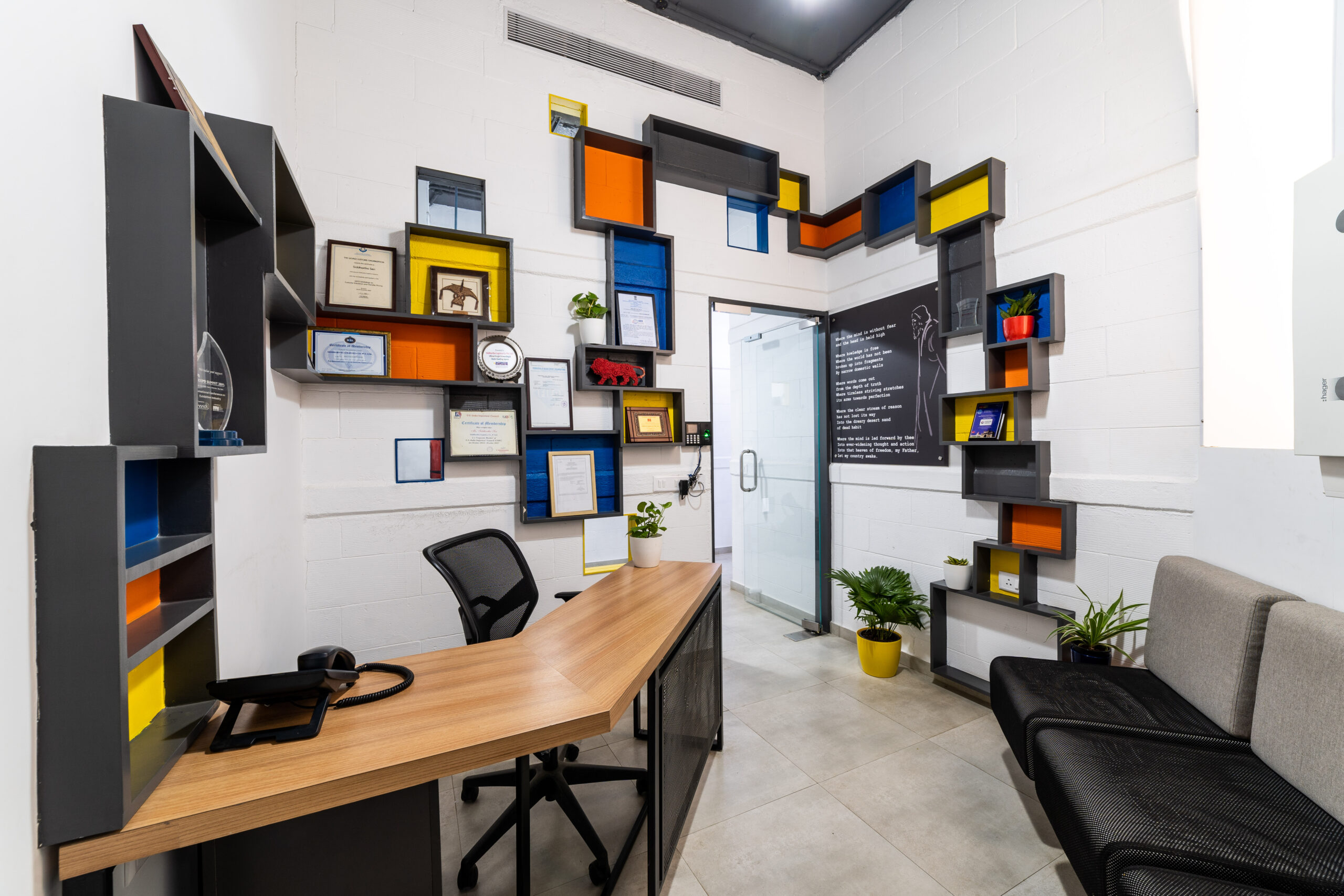 A marketing office for a logistics company strategically located near the International Airport, needed an office suitable to interact with their international clients. We designed the office in a contemporary industrial aesthetics, with exposed services, industrial light fittings, modular furniture.