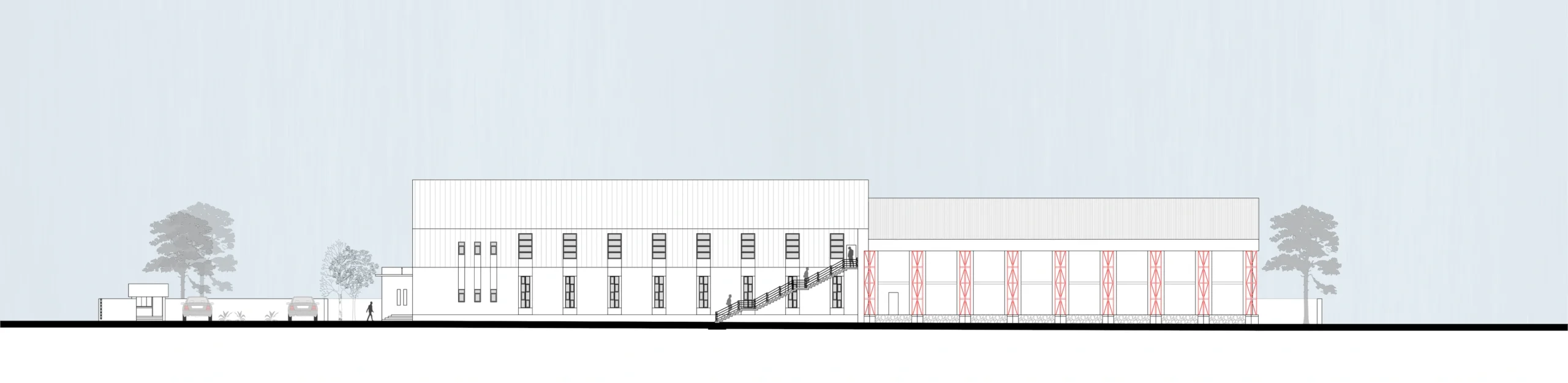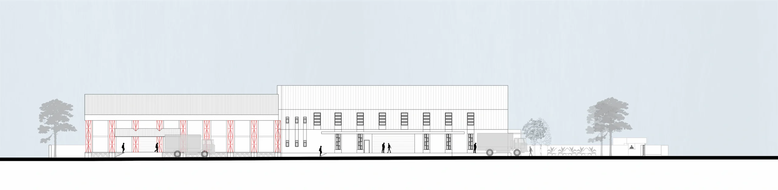 Phase 2 is a two-storied pre-engineered north light structure which was a first of its kind for Metaltek. The street facing part of the building accommodated an office and lunch room, while the rest of the space was used to expand manufacturing. The design here mimicked the edge columns to show the continuity of the Phase 1 vertical shafts of light.