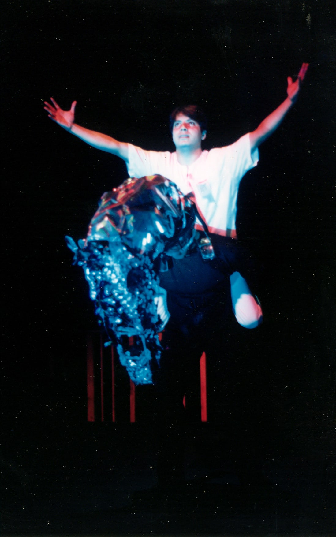 Each of the wireframe masks would be adorned with silver paper before every show. The padded horse masks were then strapped and mounted onto the black clad horses.