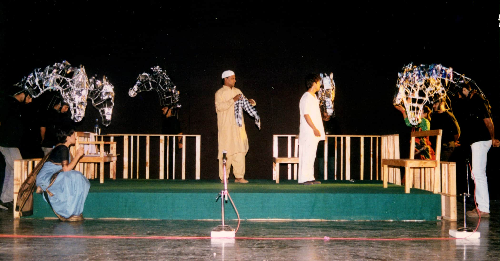 The stage is set, the stage within the stage is set, the horse masks in wireframe are mounted, the actors enter this arena – this was a set design for a play performed at Prithvi Theatre and NCPA (TATA theatre) by Vikalp.