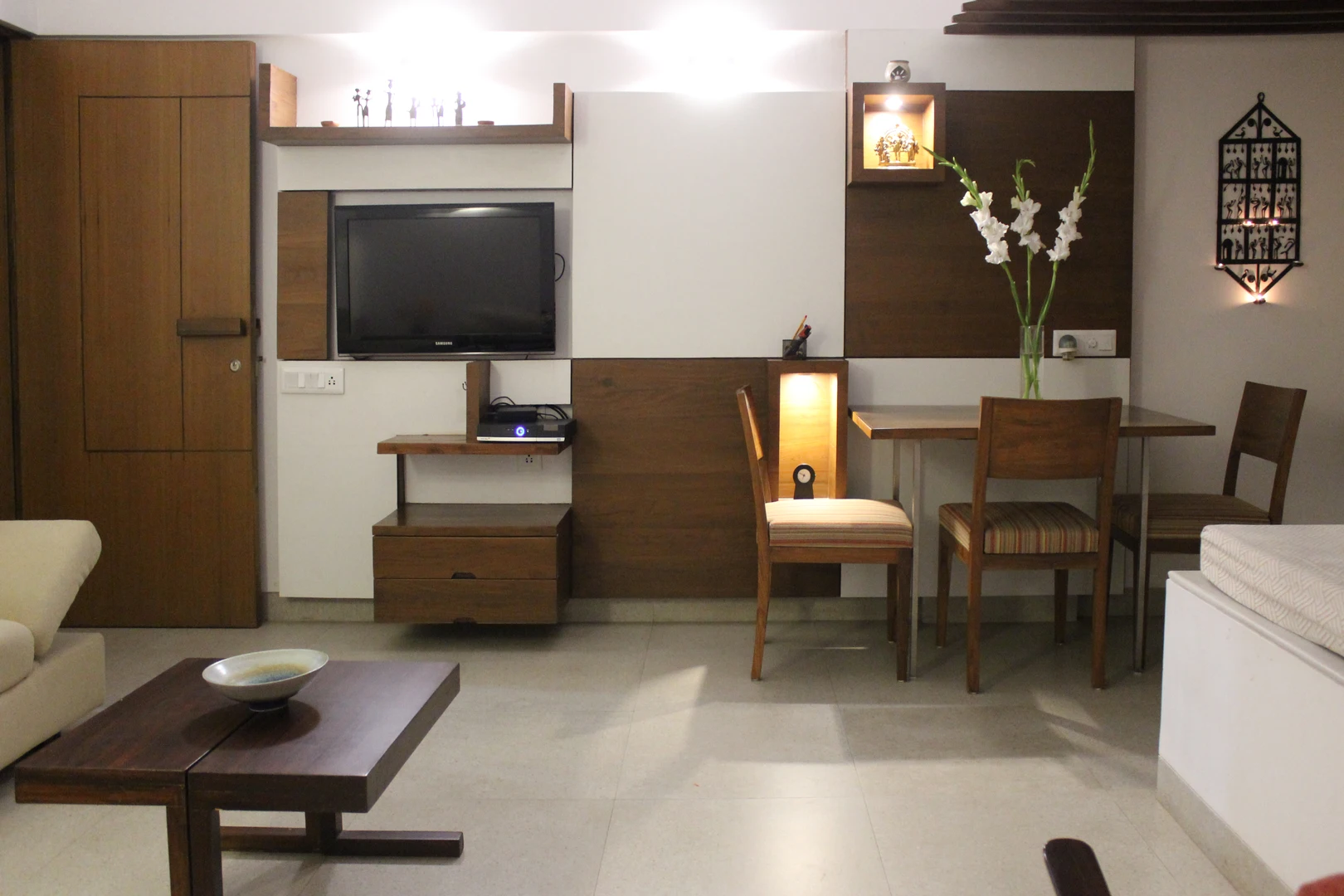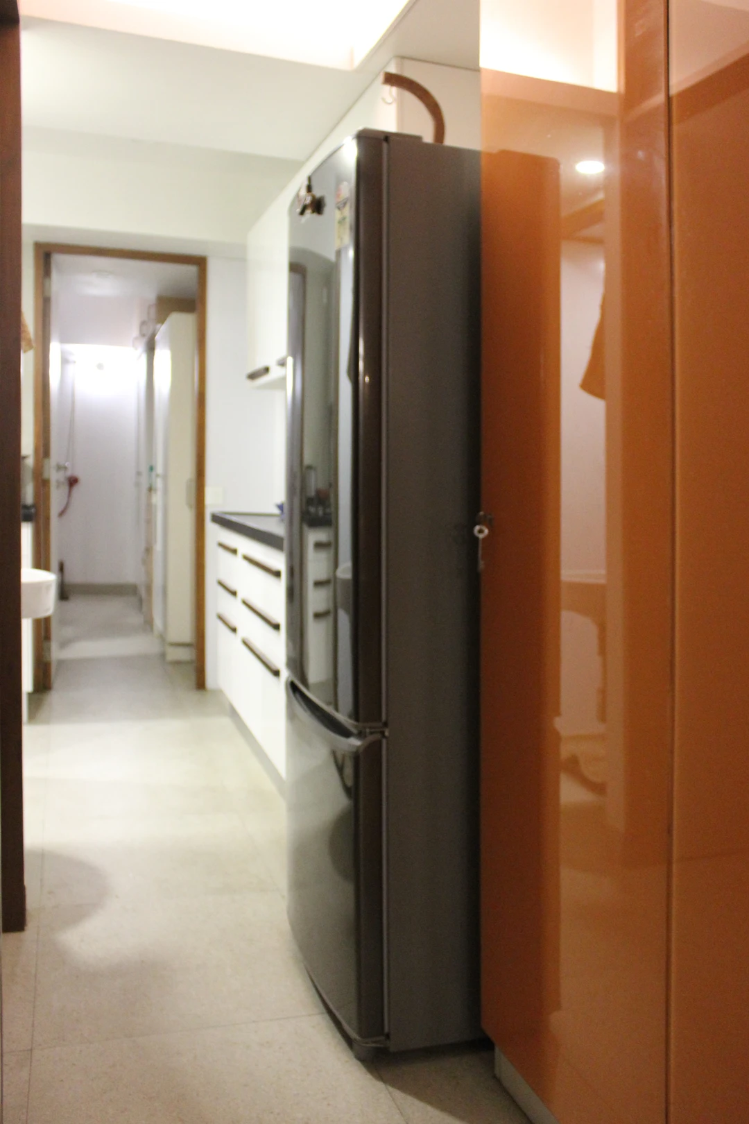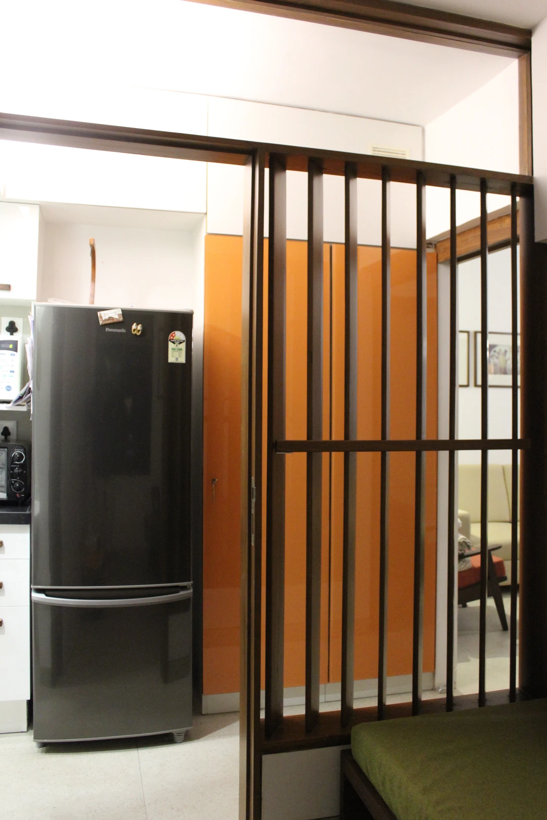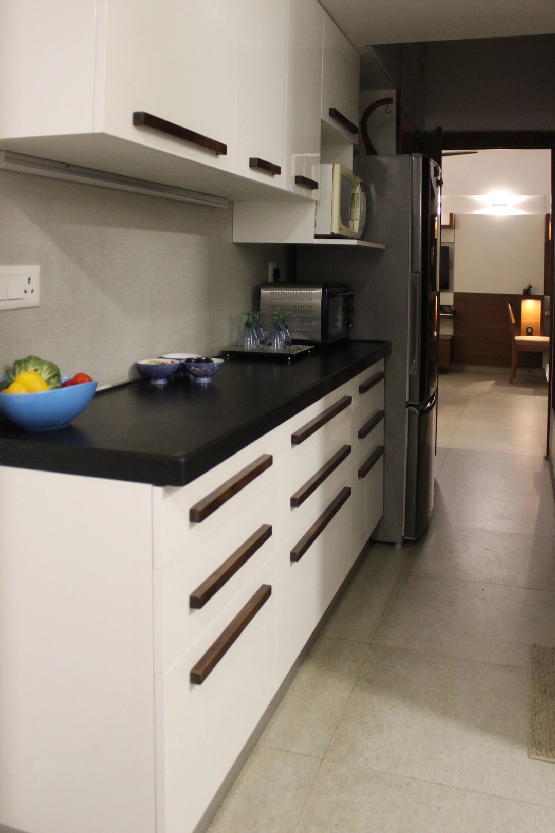 This project required a conversion from a one-bedroom apartment into two bedrooms with two full baths. We replaced all the 150mm thick existing brick walls with 75mm thick light weight Aerocon walls to create the desired spaces. The kitchen and storage hugged the periphery walls creating an acoustic barrier while providing a kitchen counter and storage units.