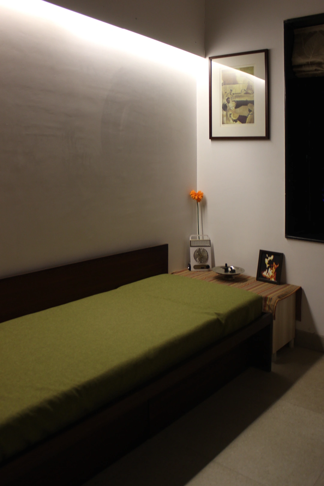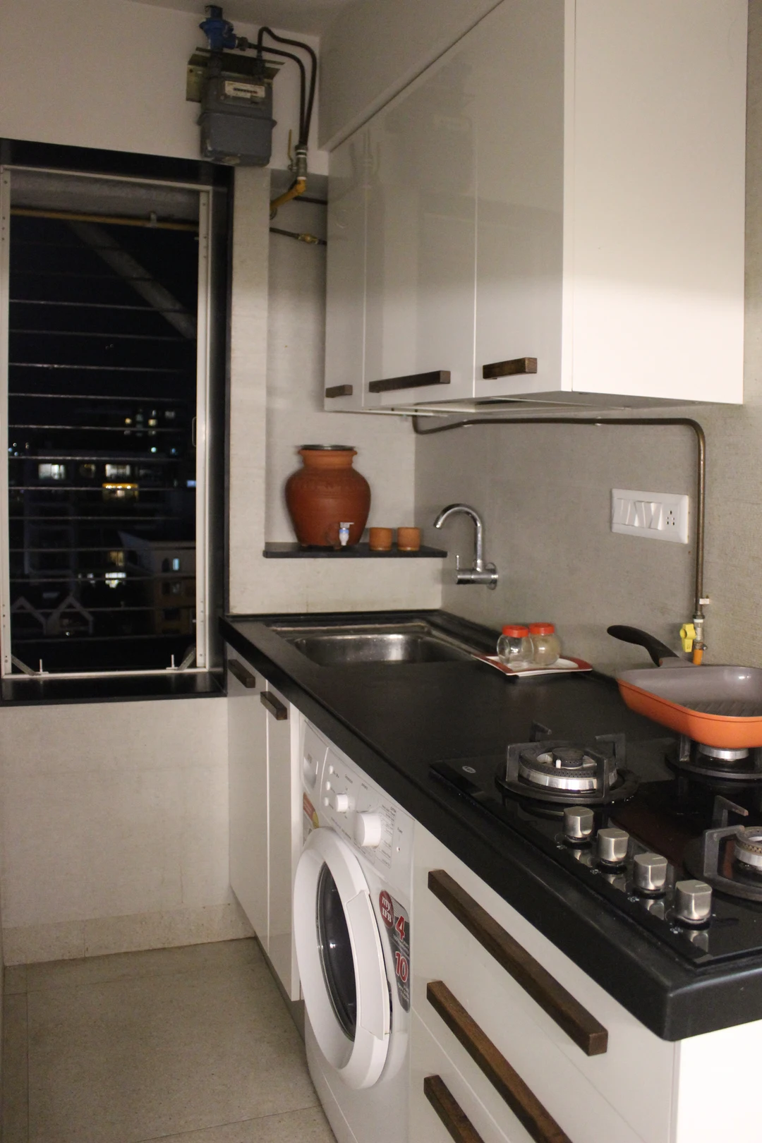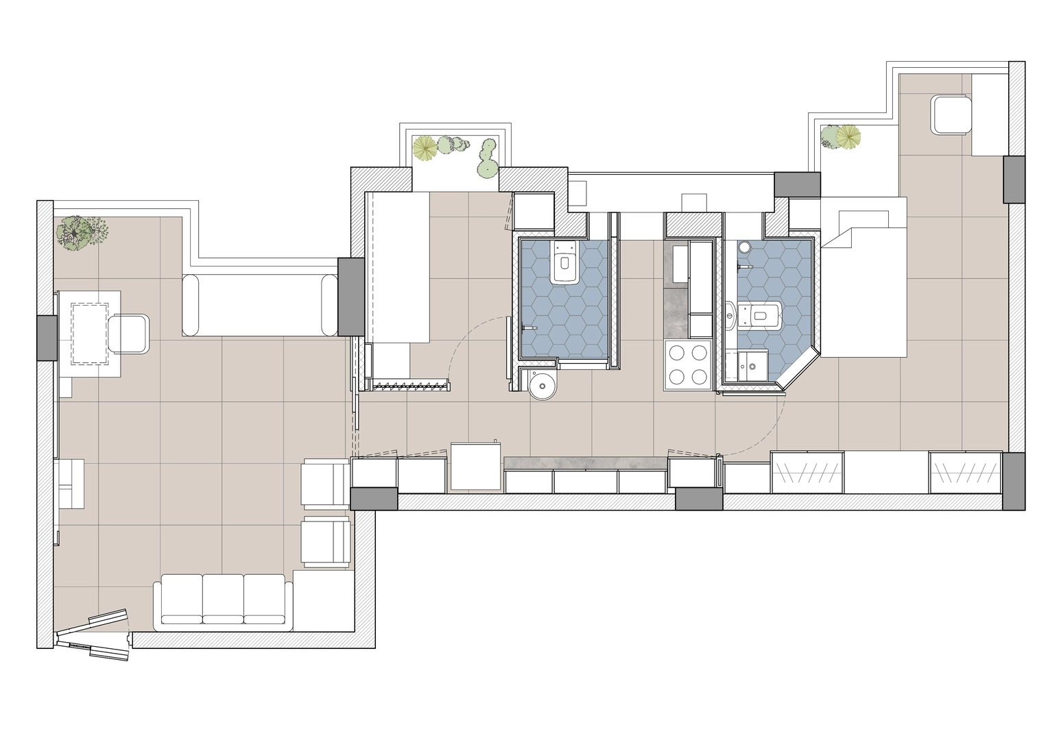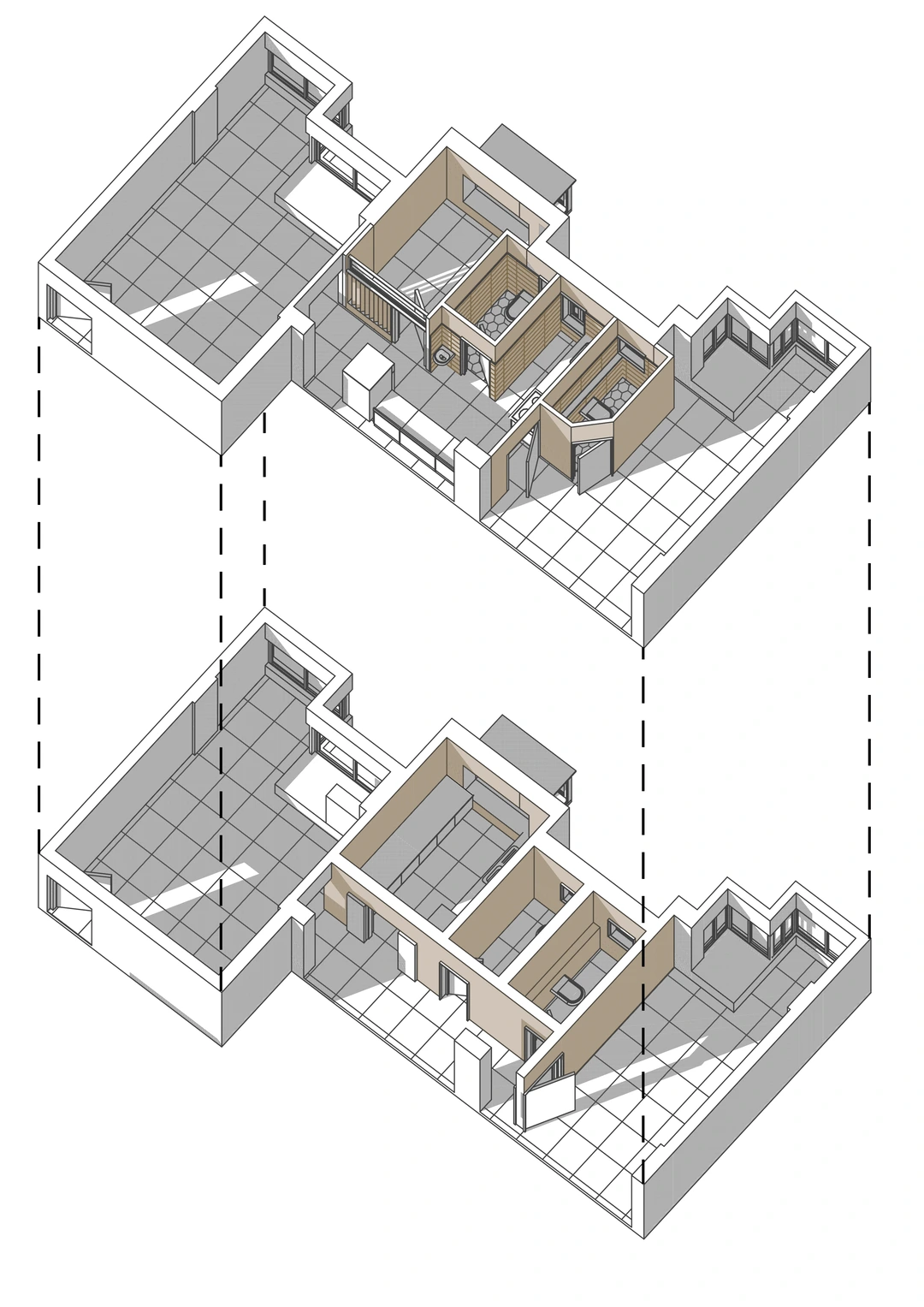 This project required a conversion from a one-bedroom apartment into two bedrooms with two full baths. We replaced all the 150mm thick existing brick walls with 75mm thick light weight Aerocon walls to create the desired spaces. The kitchen and storage hugged the periphery walls creating an acoustic barrier while providing a kitchen counter and storage units.