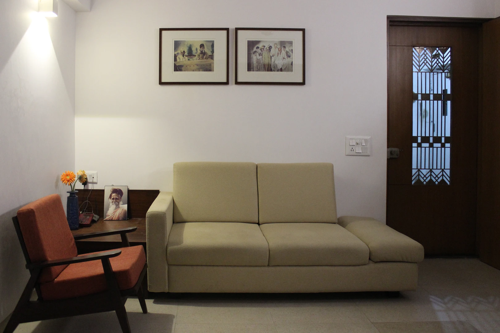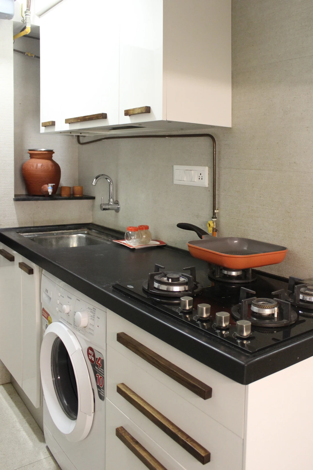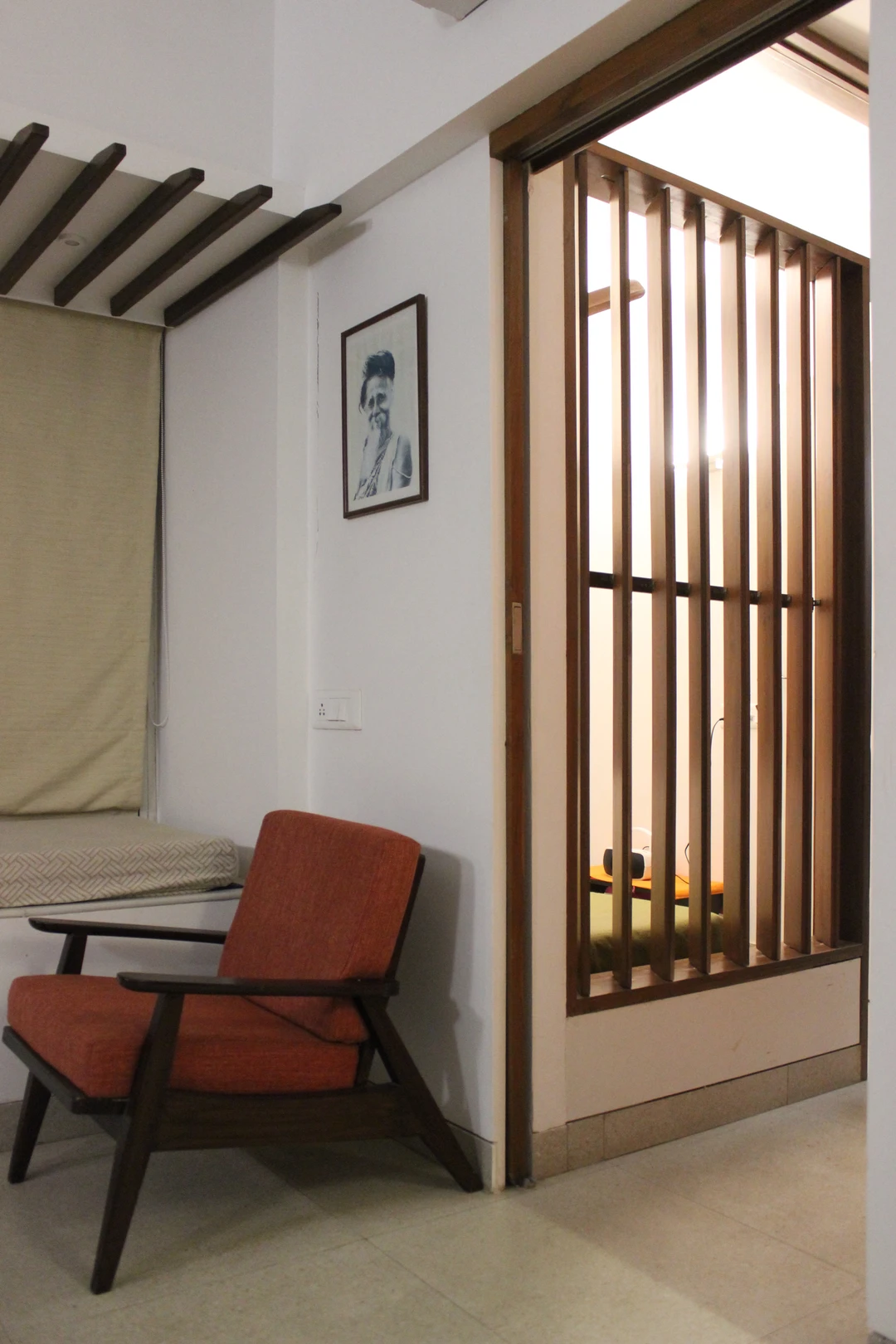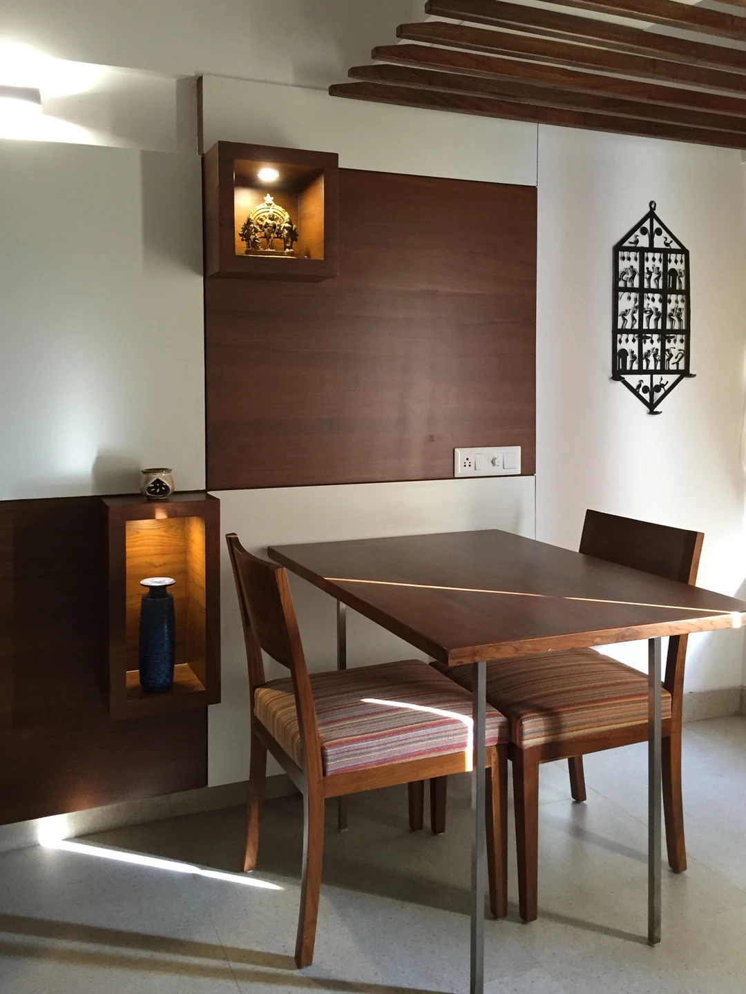This project required a conversion from a one-bedroom apartment into two bedrooms with two full baths. We replaced all the 150mm thick existing brick walls with 75mm thick light weight Aerocon walls to create the desired spaces. The kitchen and storage hugged the periphery walls creating an acoustic barrier while providing a kitchen counter and storage units.